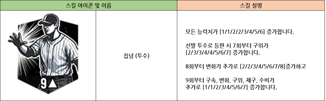- [집념(투수)] 스킬은 레벨에 따라 모든 능력치를 증가 시키고 선발 투수로 등판 시