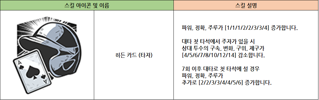 - [히든 카드(타자)] 스킬은 레벨에 따라 파워, 정확, 주루 능력치를 증가 시키고