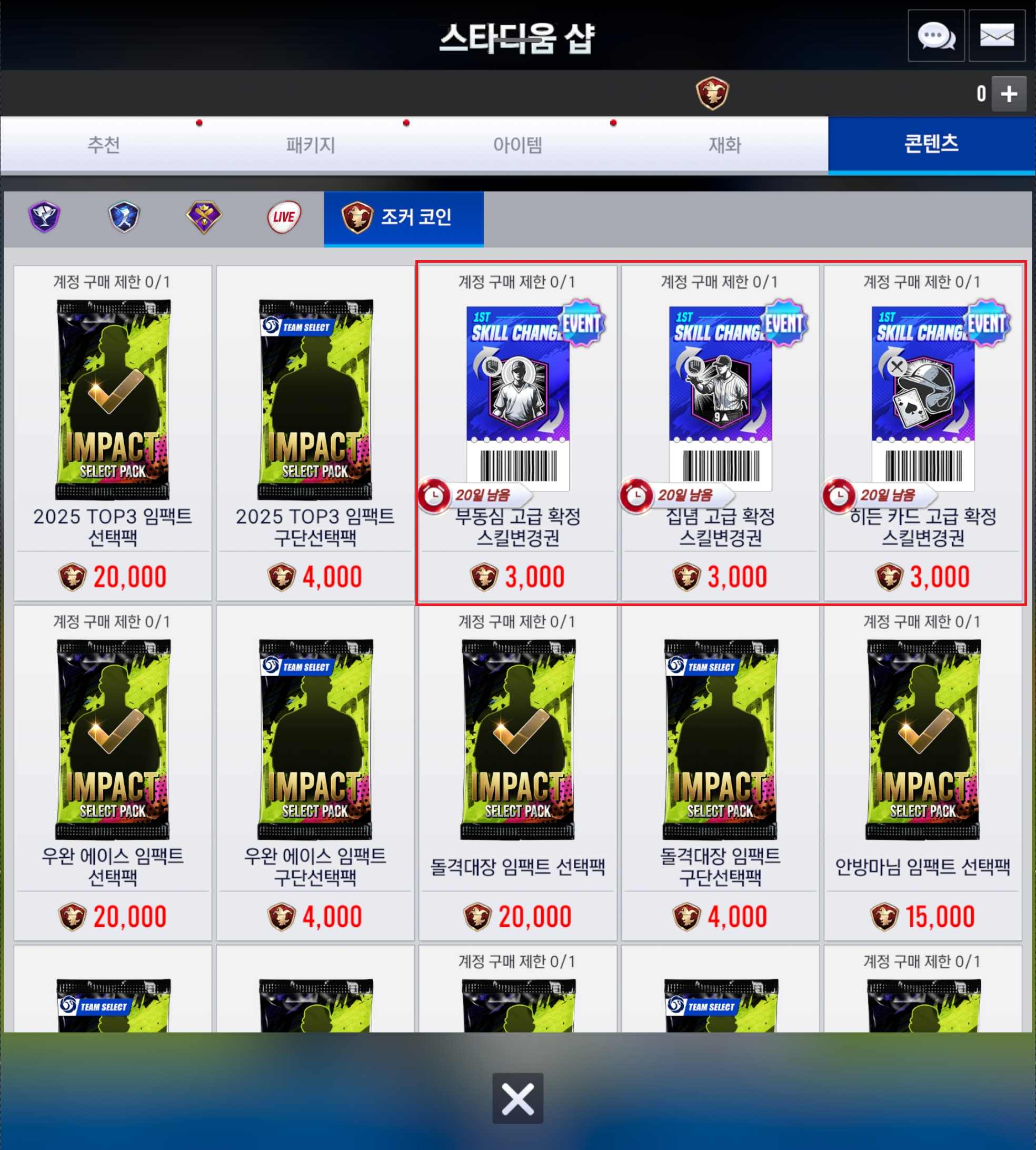 - 조커 코인 상점에 [부동심(투수) 고급 확정 스킬변경권], [집념(투수) 고급 확정 스킬변경권], [히든 카드(타자) 고급 확정 스킬변경권]이 추가됩니다.
