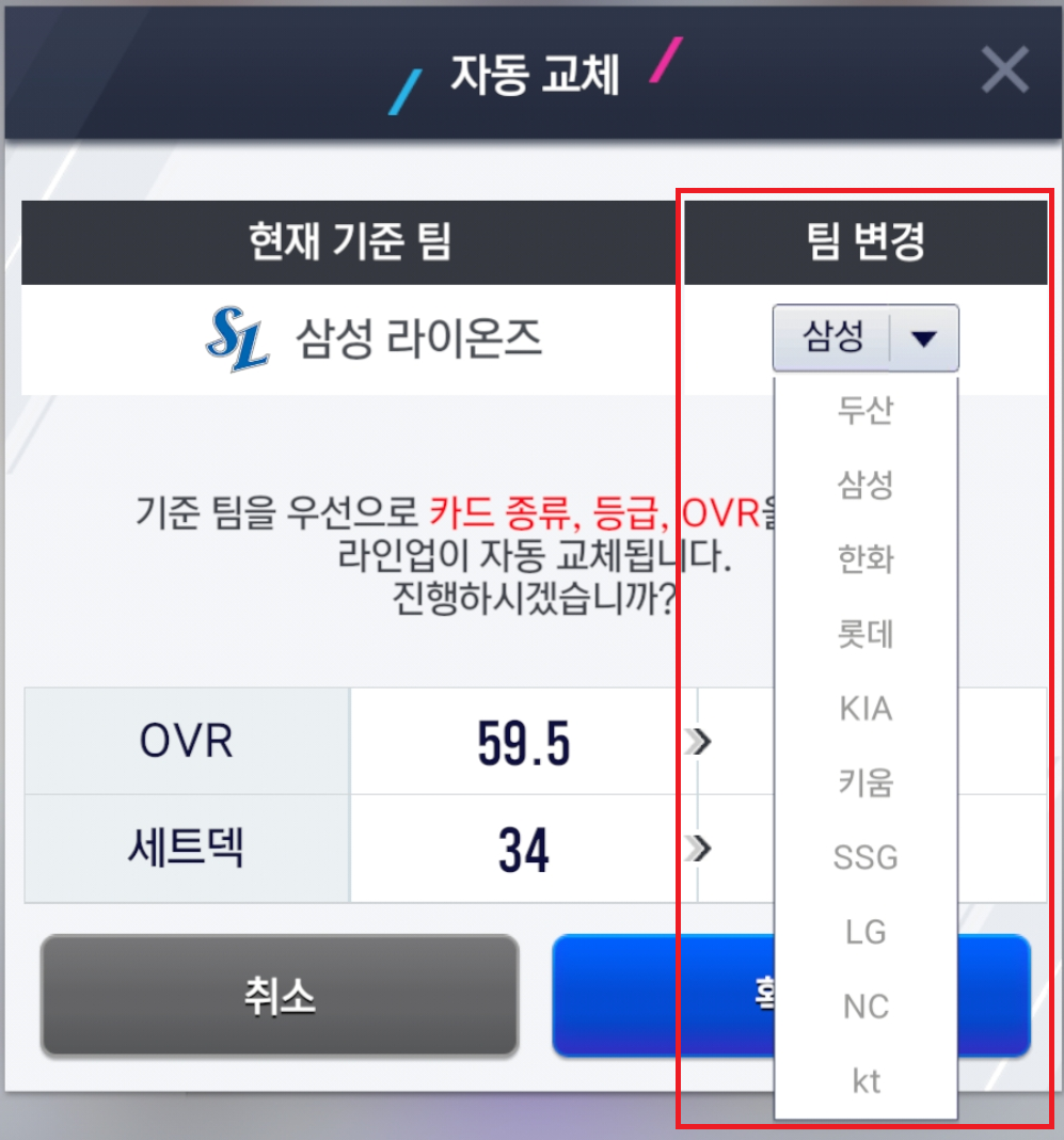 - 라인업 - 라인업 자동 교체 진행 시 세트덱 팀 기준이 아닌 선택한 팀을 기준으로 자동 교체가 진행되도록 개선됩니다.