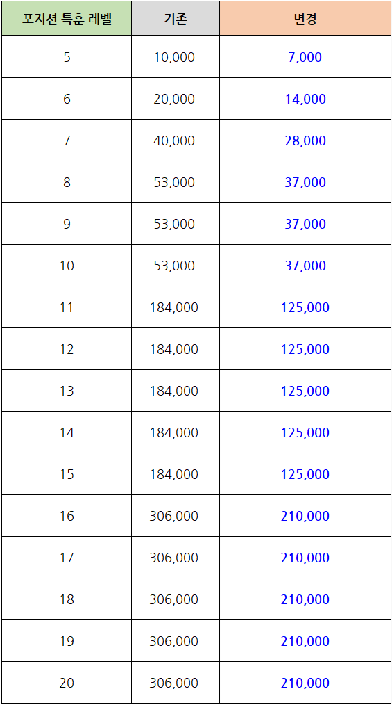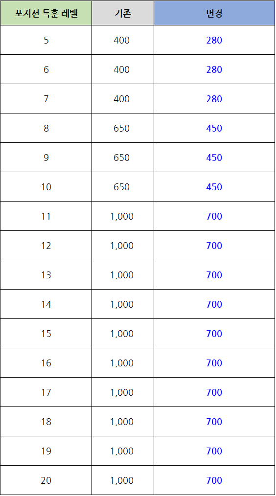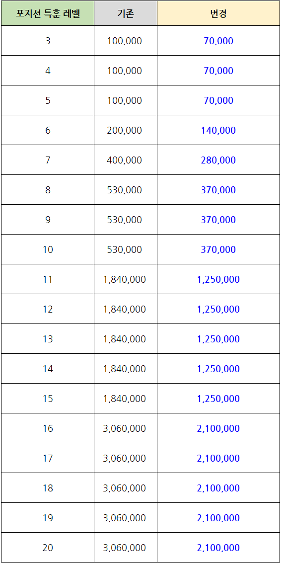 - 포지션 특훈 진행 시 필요한 훈련 카드량, 강화 카드량, 포인트량이 소폭 감소됩니다.
