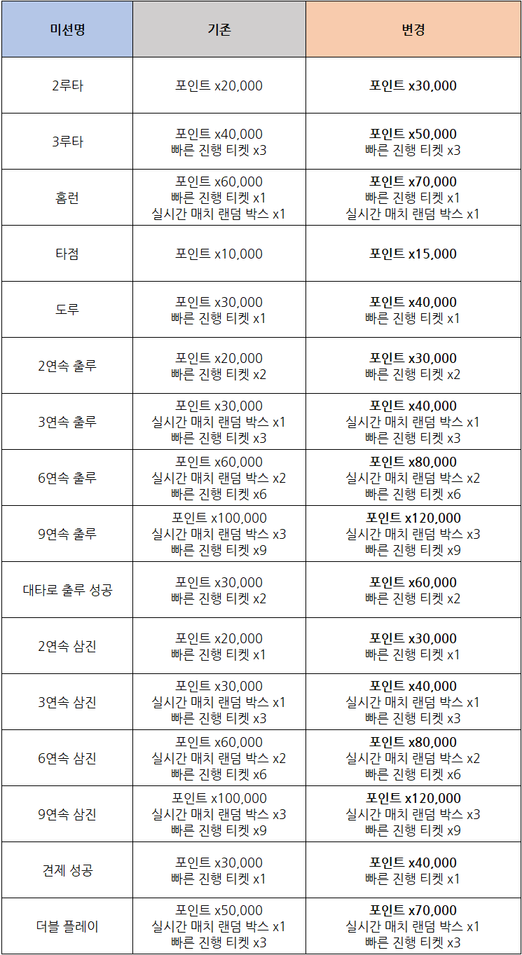 - 실시간 매치 직접 플레이 미션의 보상 중 포인트량이 소폭 증가됩니다.