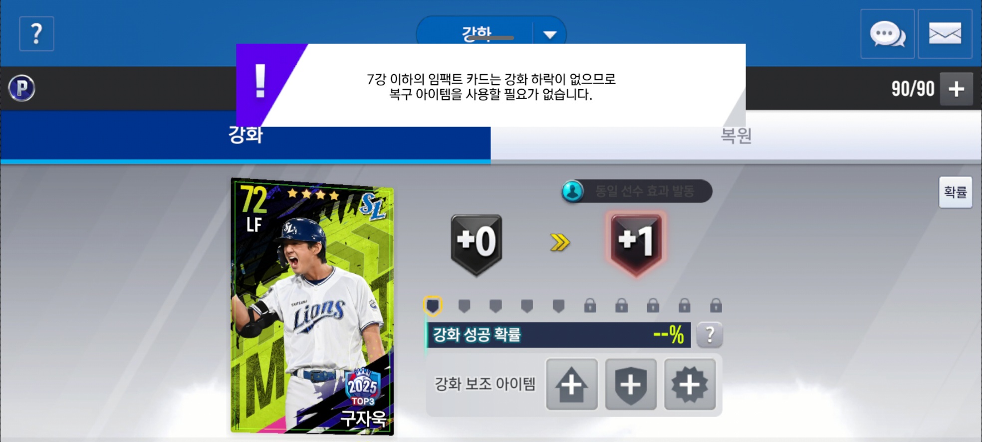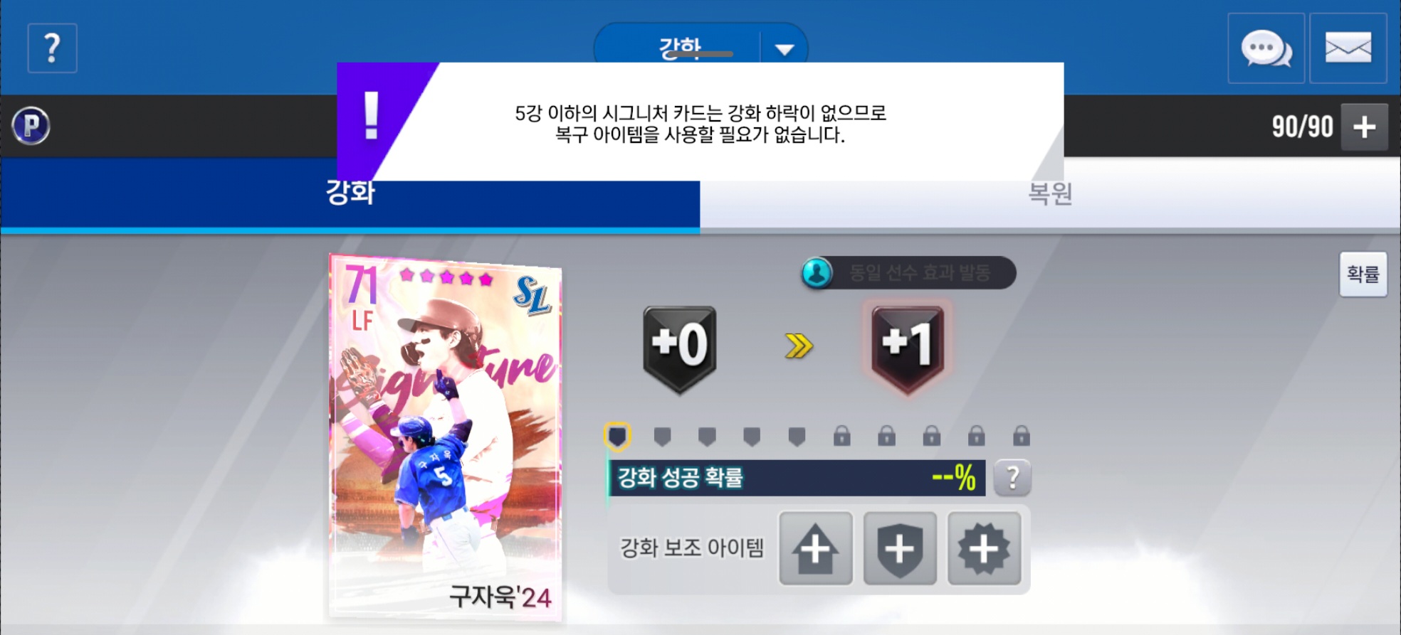 | 투수 | 국가대표 선수 카드 x1 (강화 5레벨, 훈련 10레벨) | 30 |