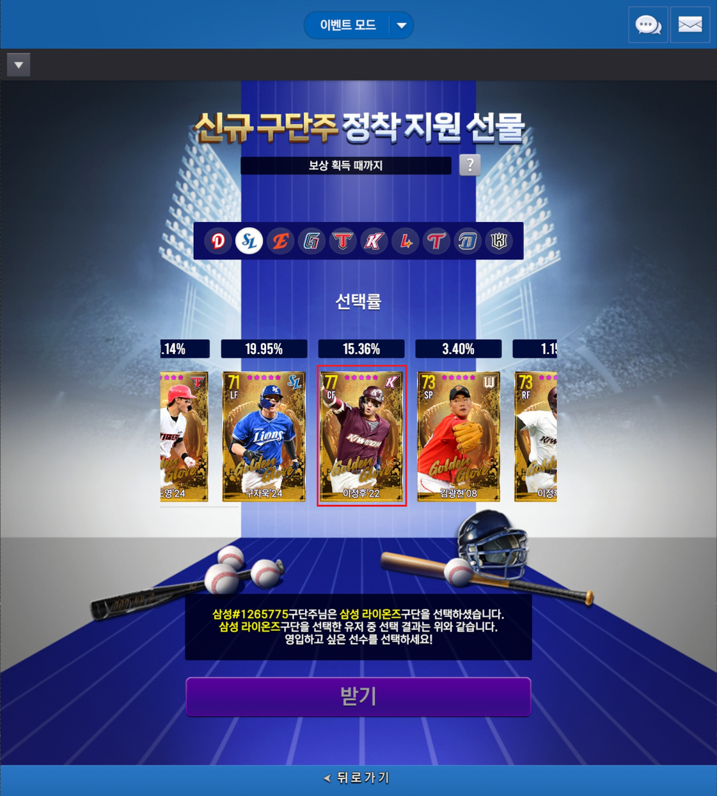 - 신규 구단주 정착 지원 이벤트 내 22년 이정후 골든글러브 선수 카드가 추가됩니다.