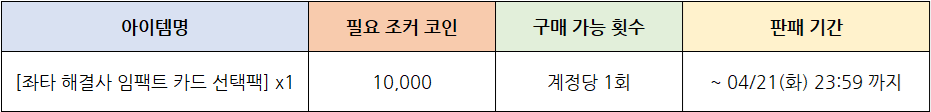 - [좌타 해결사 임팩트 선택팩]은 조커 코인을 사용하여 04/21(화) 23:59까지 구매하실 수 있습니다.