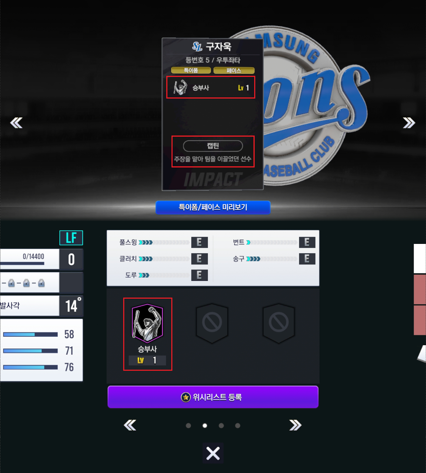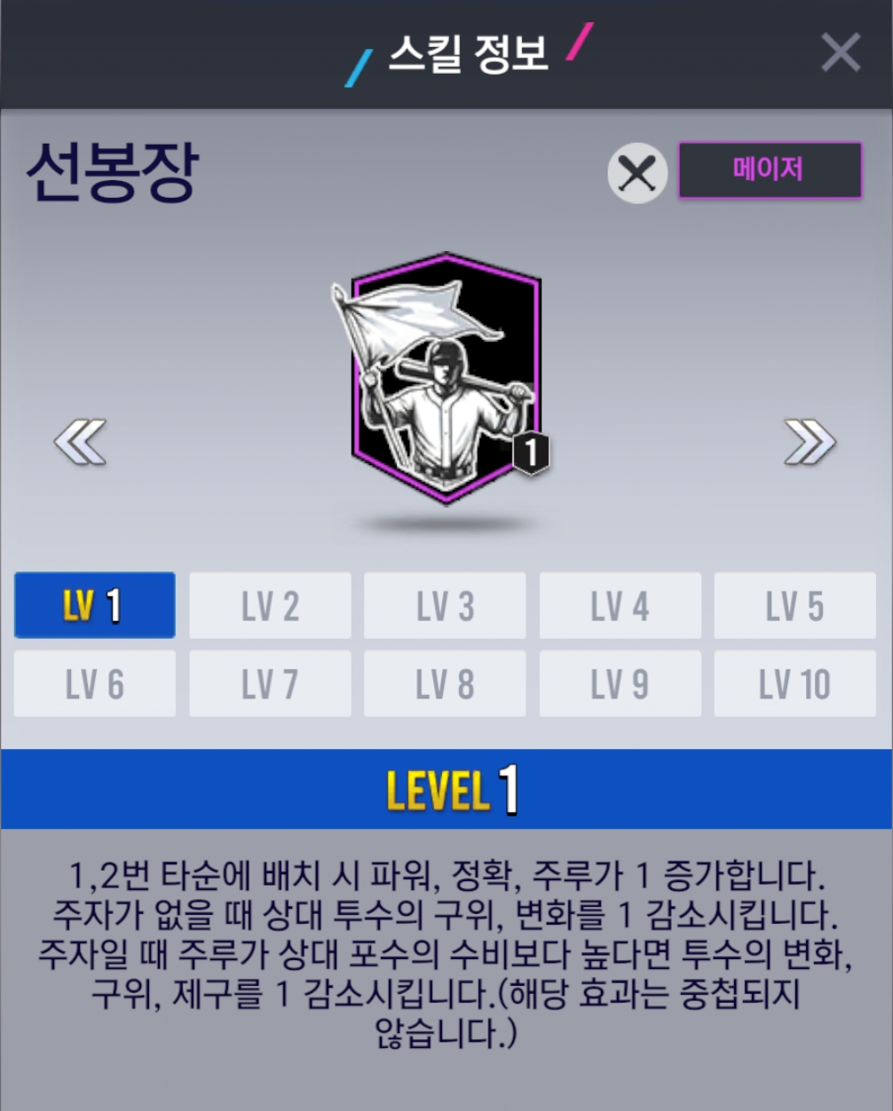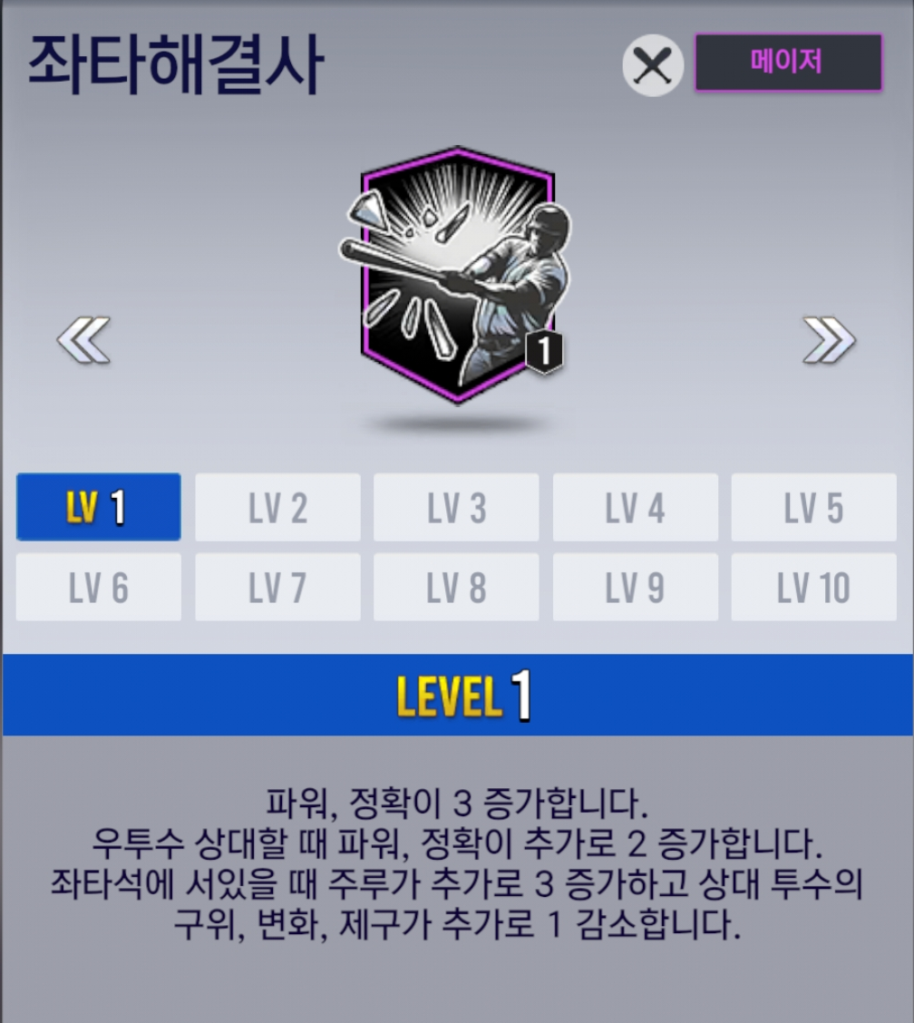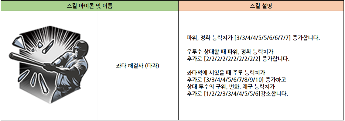 - [좌타 해결사(타자)] 스킬은 레벨에 따라 파워와 정확 능력치가 증가합니다.