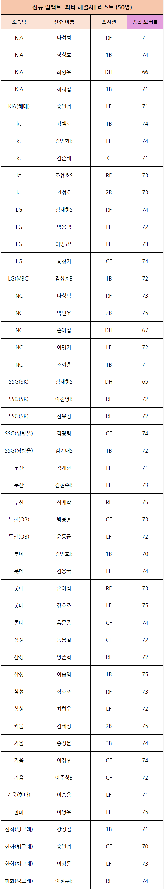 - 신규 [좌타 해결사] 임팩트 선수 카드는 팀별 5명씩 총 50명이 추가됩니다.