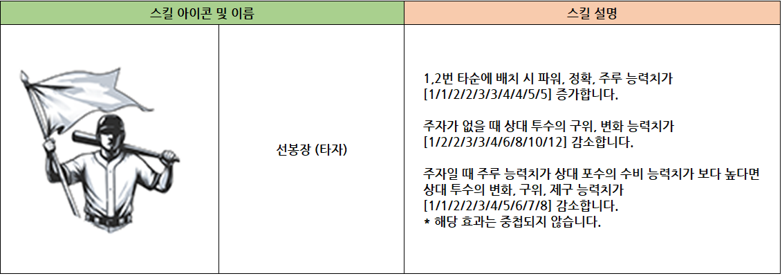 - [선봉장(타자)] 스킬을 보유한 타자를 1,2번 타순에 배치 시 파워, 정확, 주루 능력치가 증가합니다.