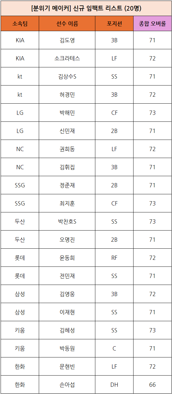 - 신규 [분위기 메이커] 임팩트 선수 카드는 팀별 2명씩 총 20명이 추가됩니다.