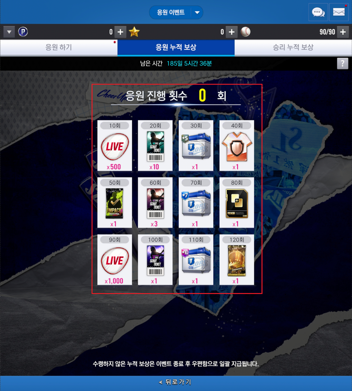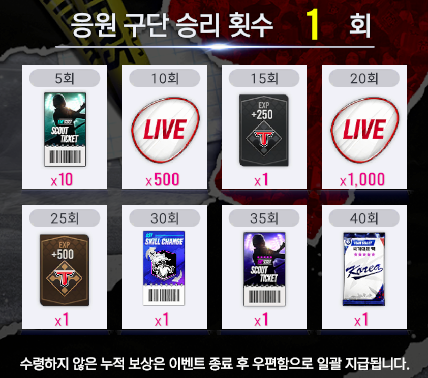 * 승리 누적 보상 중 15회, 25회의 경우 응원 구단에 맞게 지급됩니다.