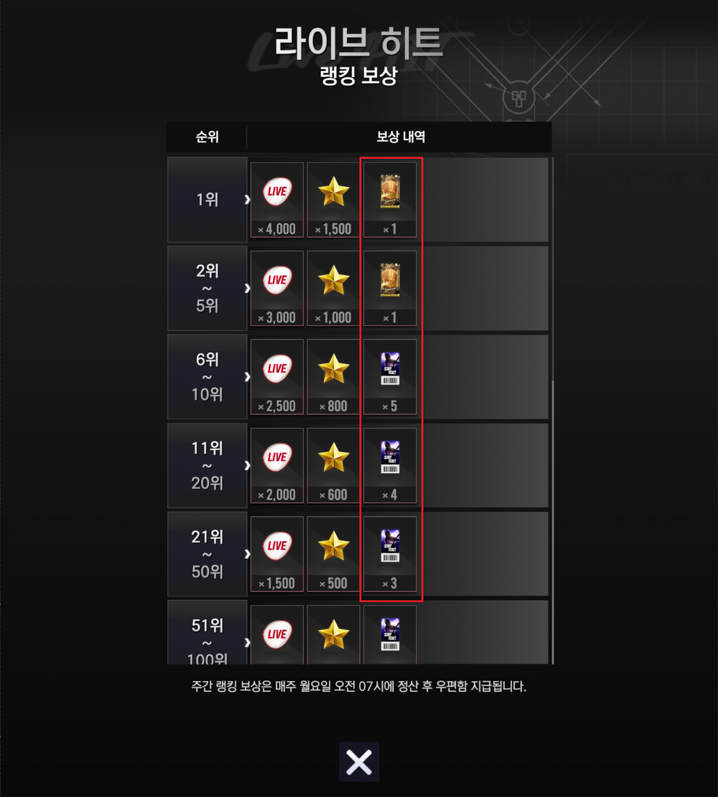 - 그 외 이번 [라이브 히트]부터 주간 랭킹 6위~상위 2.99%까지
