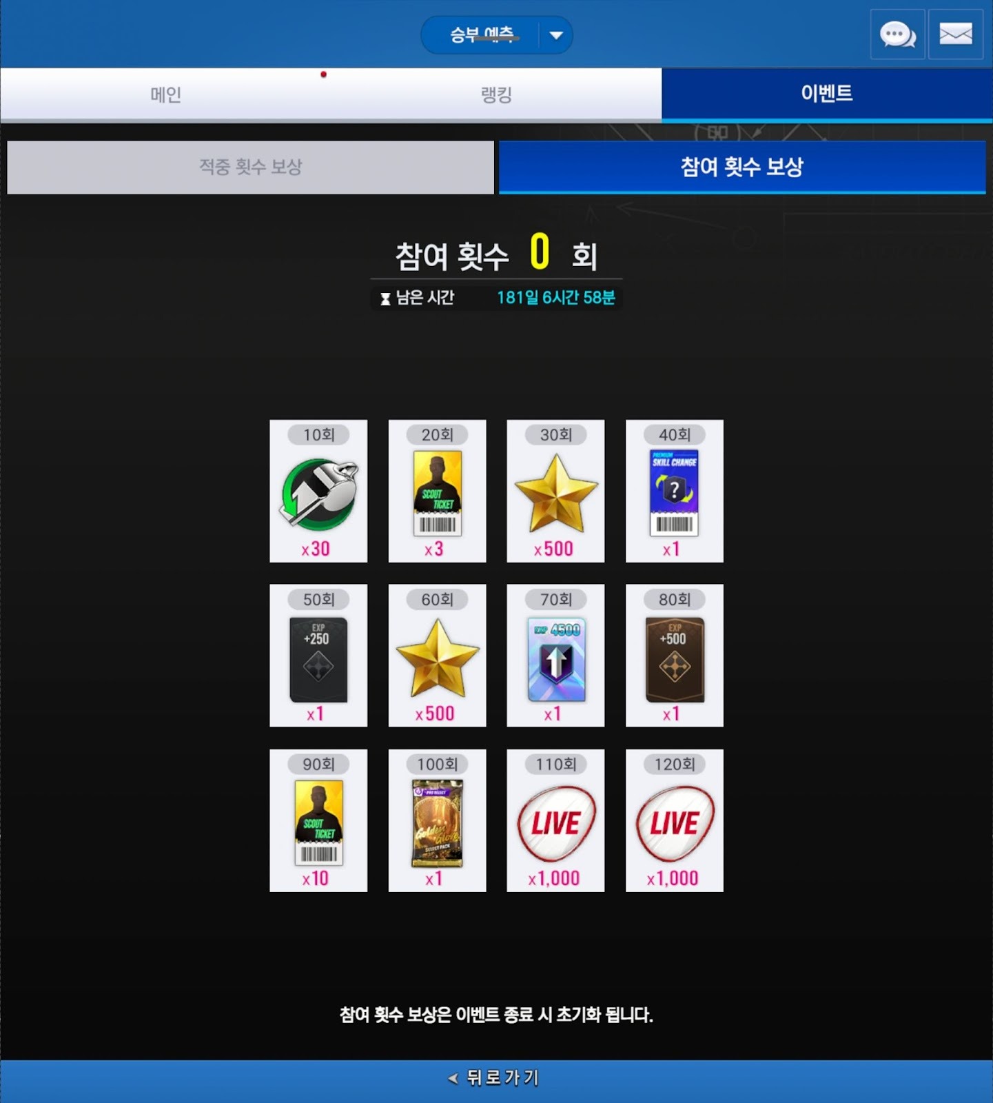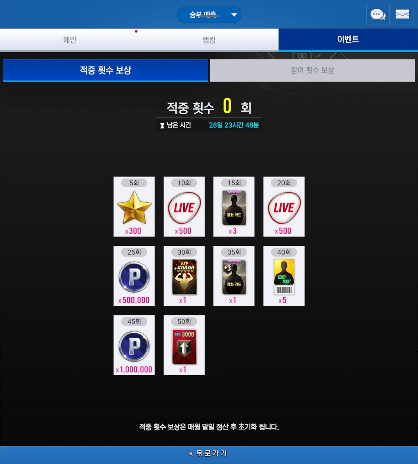 - [승부 예측] 콘텐츠의 참여 횟수 보상의 경우 50회와 80회에 특훈 카드가 추가되었으며,