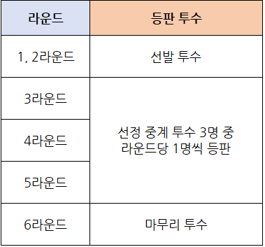 - 1, 2라운드 선발 투수는 1~5번 선발 중 한 명이 등판합니다.