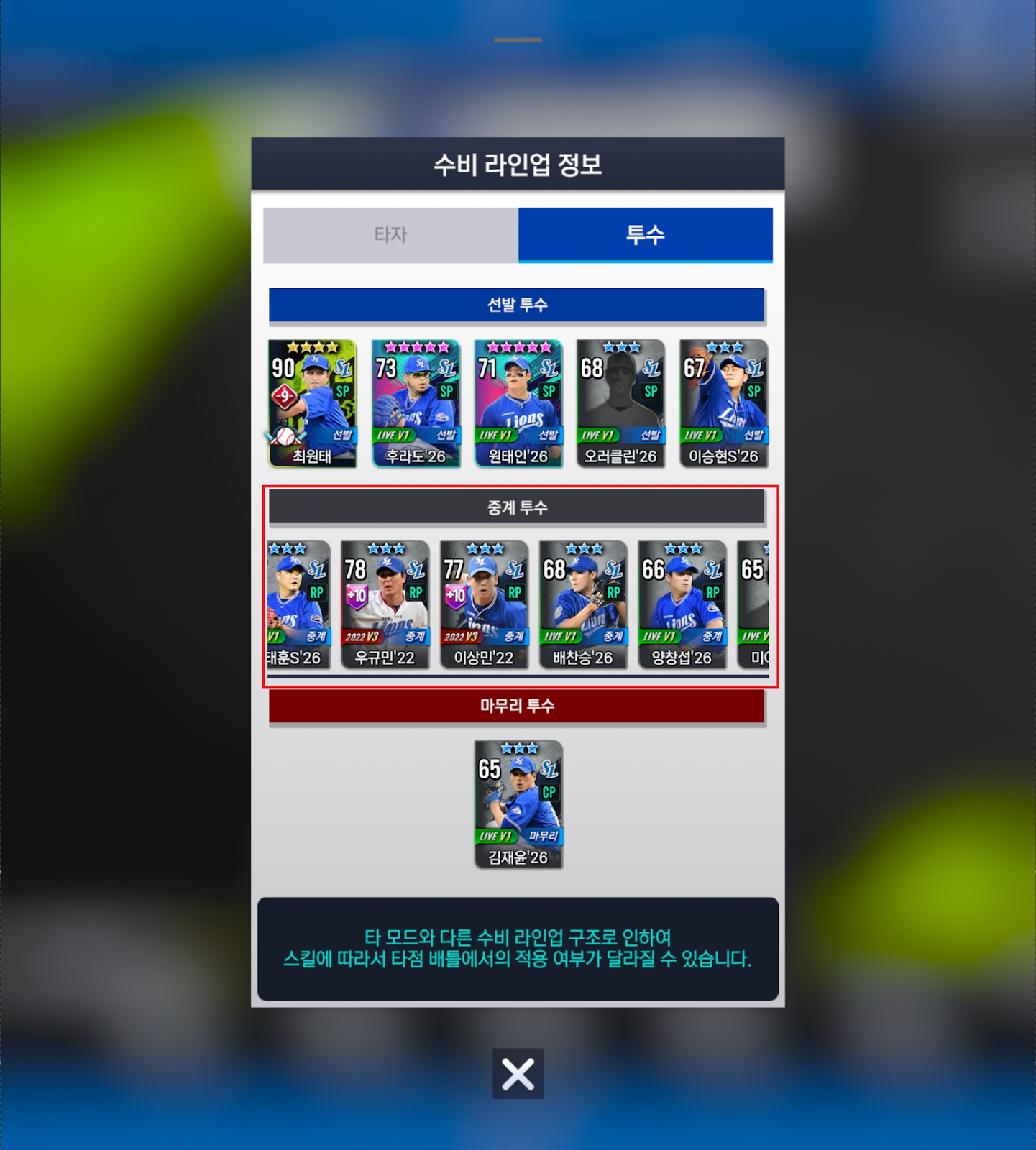 OVR이 높은 1~3번 중계 투수를 선정하게 됩니다.