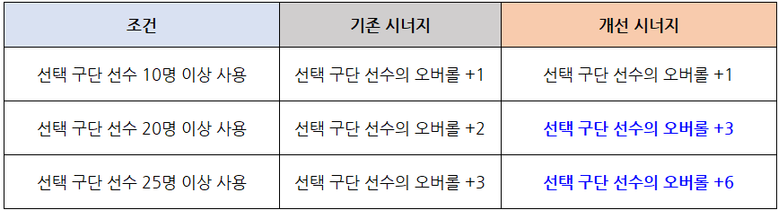 - 클럽 라인업 시너지 효과 중 동일 구단 시너지가 개선됩니다.