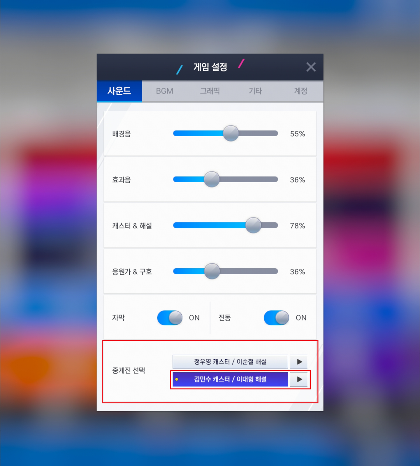 - 구단 관리>게임설정>사운드에서 기존 이순철 해설위원과 정우영 캐스터의 조합,