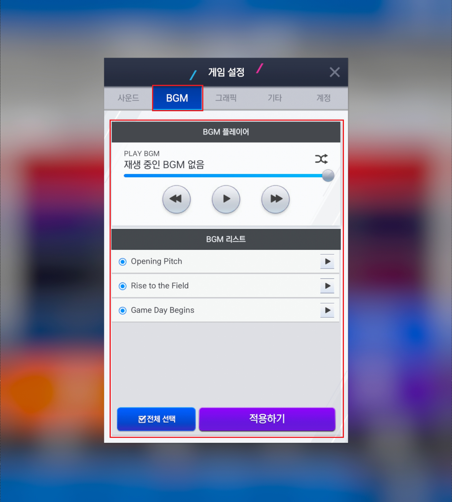 - 구단 관리>게임설정 내 BGM 메뉴가 추가되었으며 해당 메뉴를 통해