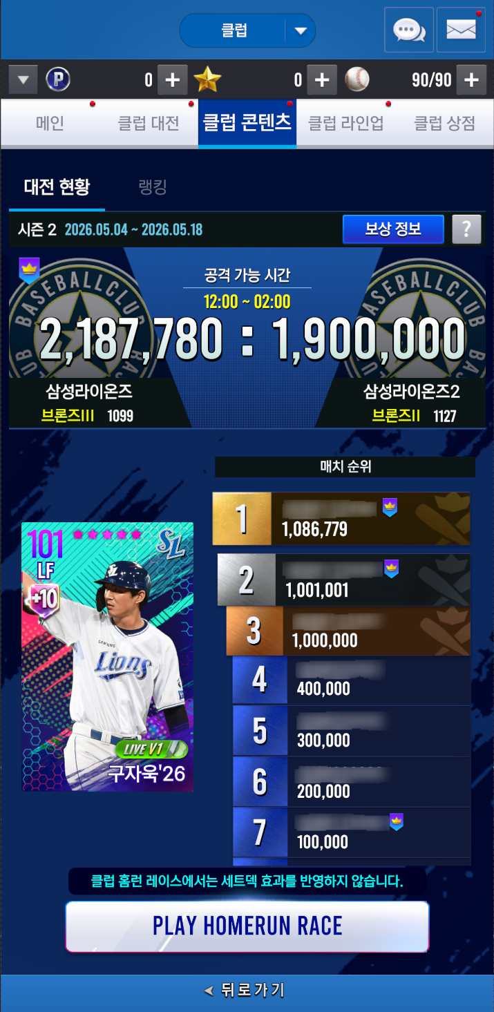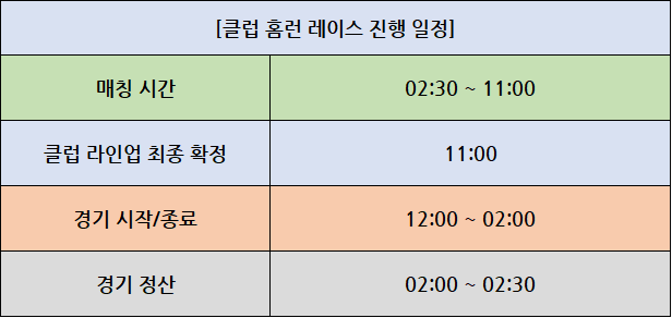 - [클럽 홈런 레이스]는 2주간 매일 다른 상대와 12:00 ~ 02:00에 진행됩니다.