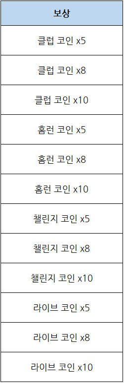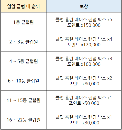 * 일일 승패 보상은 클럽의 승패에 따른 보상이며, 1회 이상 참여한 클럽원 모두 획득 가능한 보상입니다