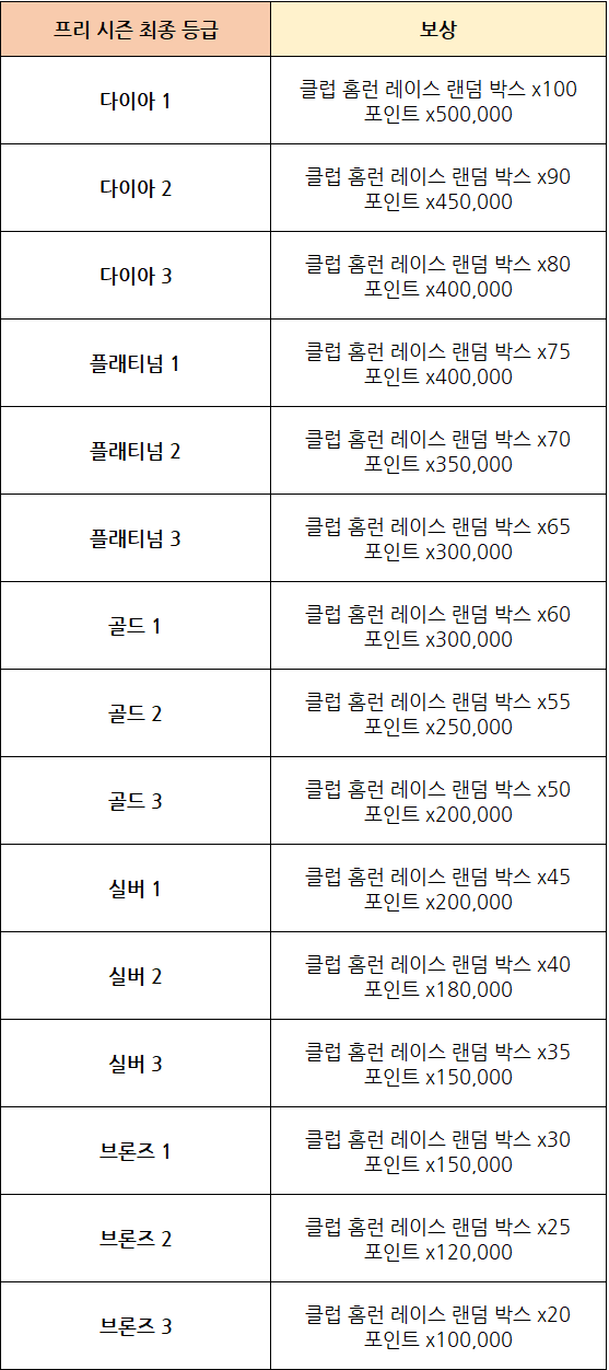※ 프리 시즌의 보상은 임시로 설정된 보상이며 정규 시즌이 시작되면 좀 더 풍성한 보상으로 찾아뵐 예정입니다.