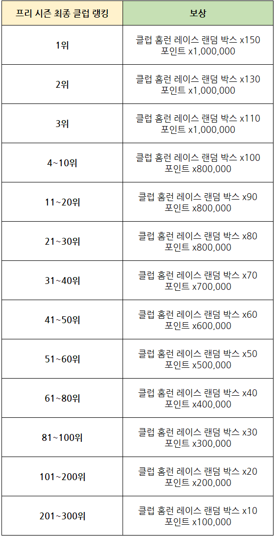 * 시즌 종료 시 클럽의 순위에 따라 지급되는 보상 이며,
