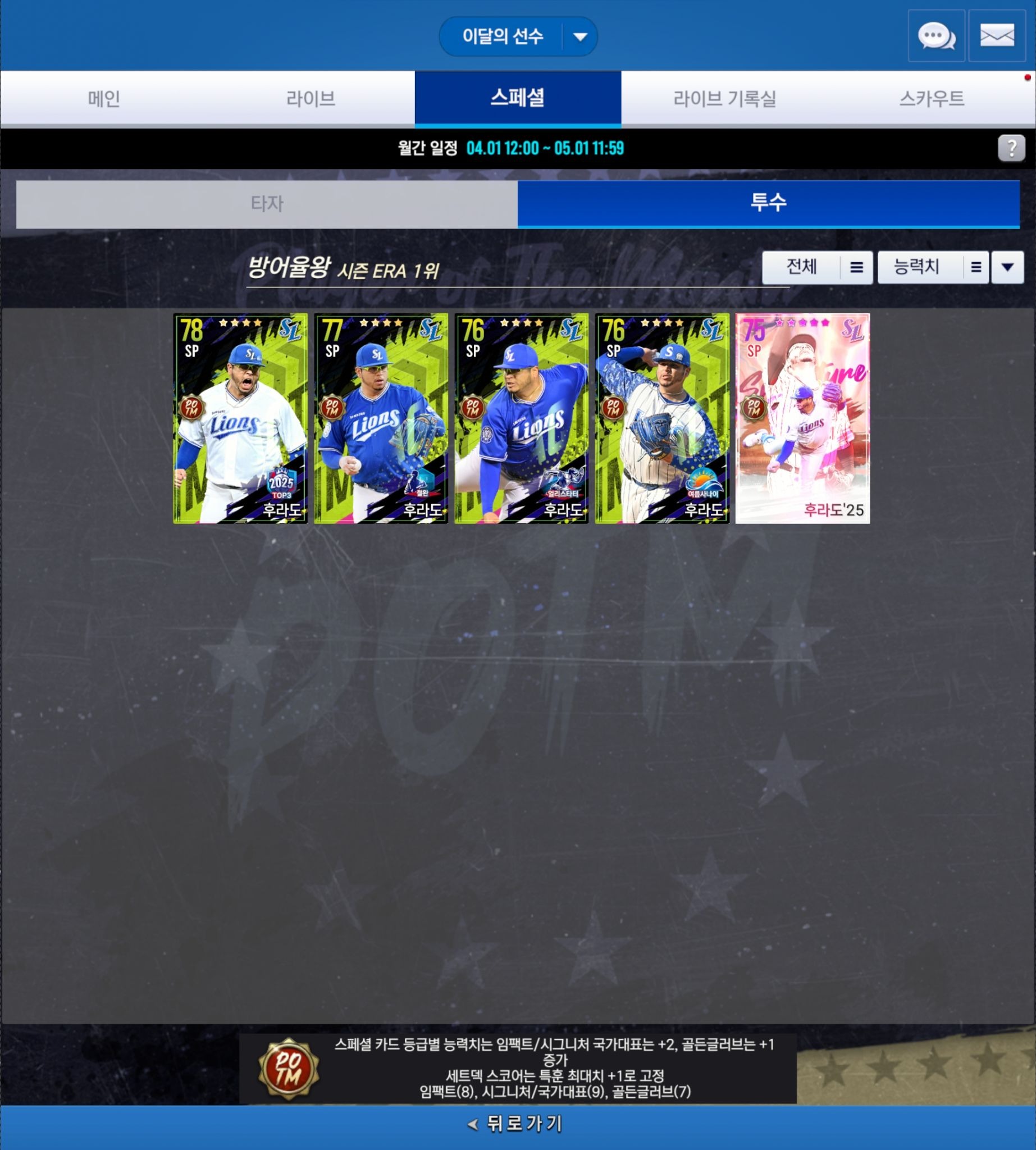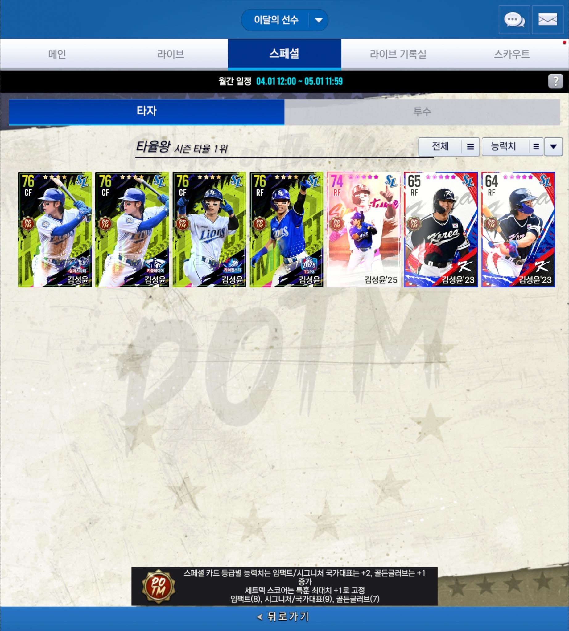 * 스페셜 카드 종류 : 라이브 올스타, 임팩트, 시그니처, 골든글러브, 국가대표, FA임팩트, FA시그니처