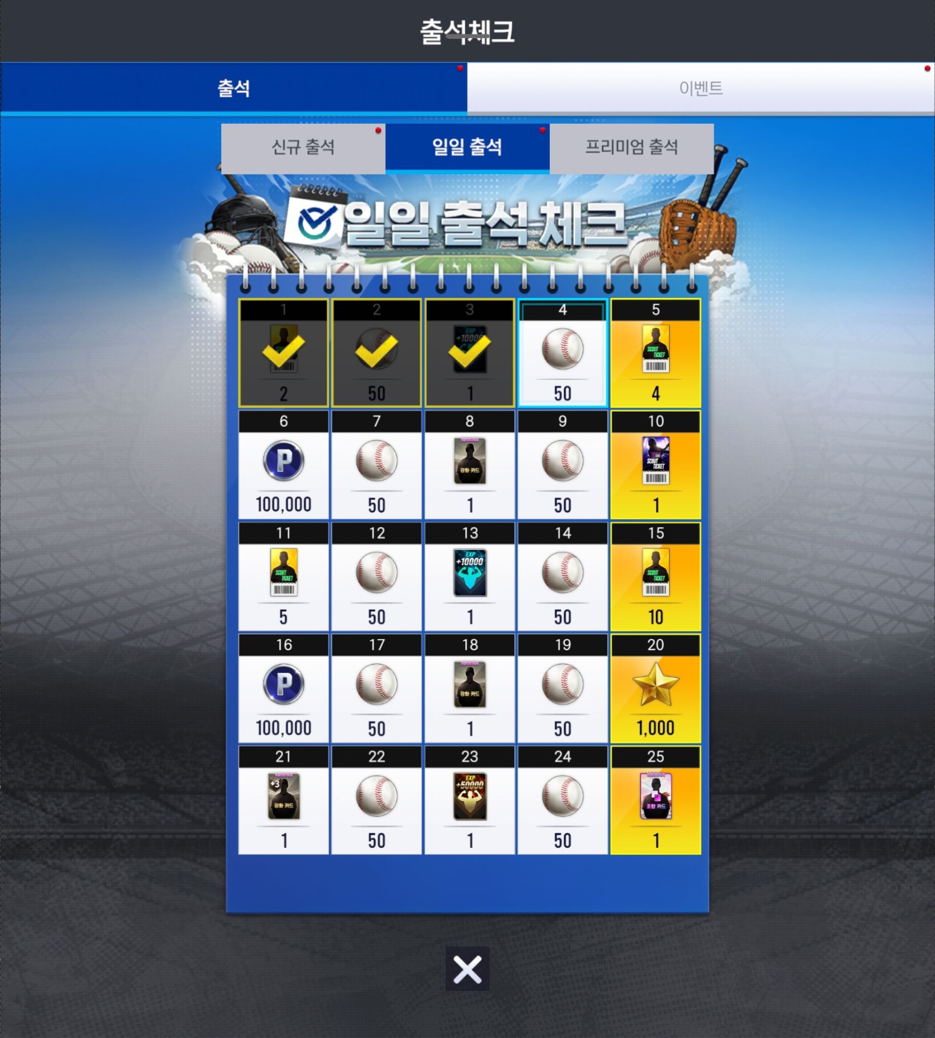 - 일일 출석 체크와 프리미엄 출석 체크 일자가 동일하게 체크됩니다.