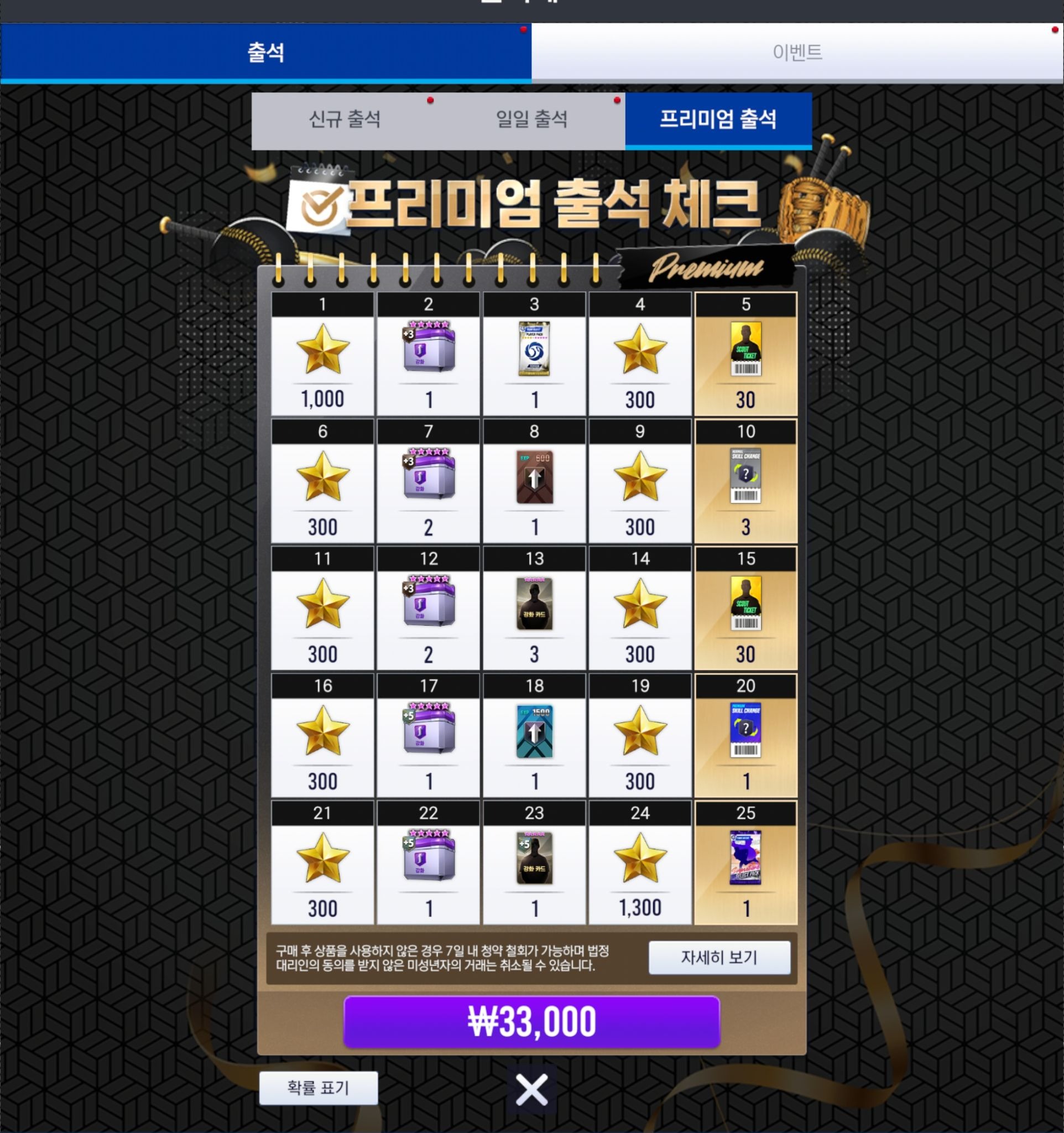* V.5.01.00 업데이트 이전에 프리미엄 출석을 구매하신 구단주 분들의 경우 업데이트 이후 개선된 보상으로 변경될 예정입니다.