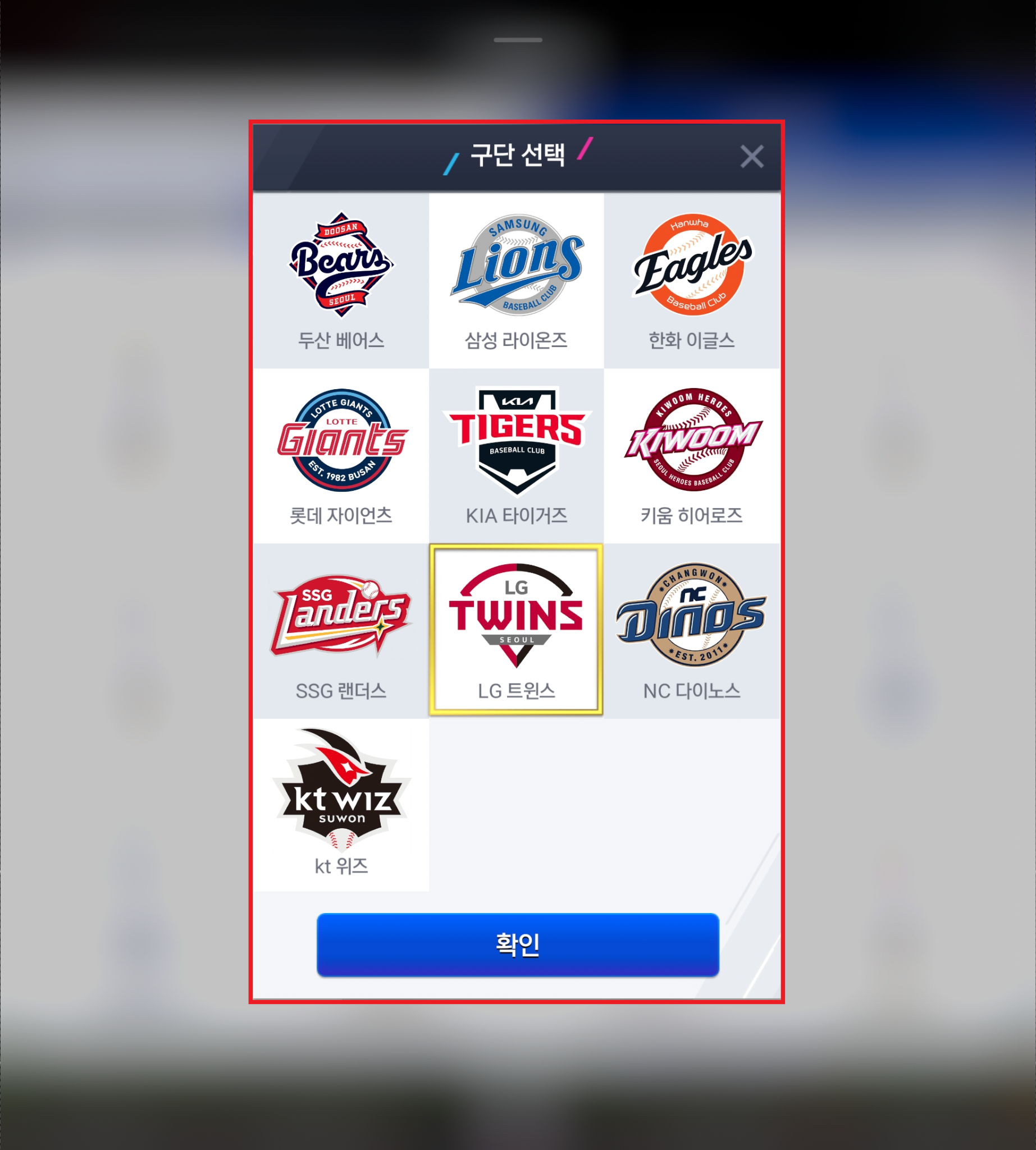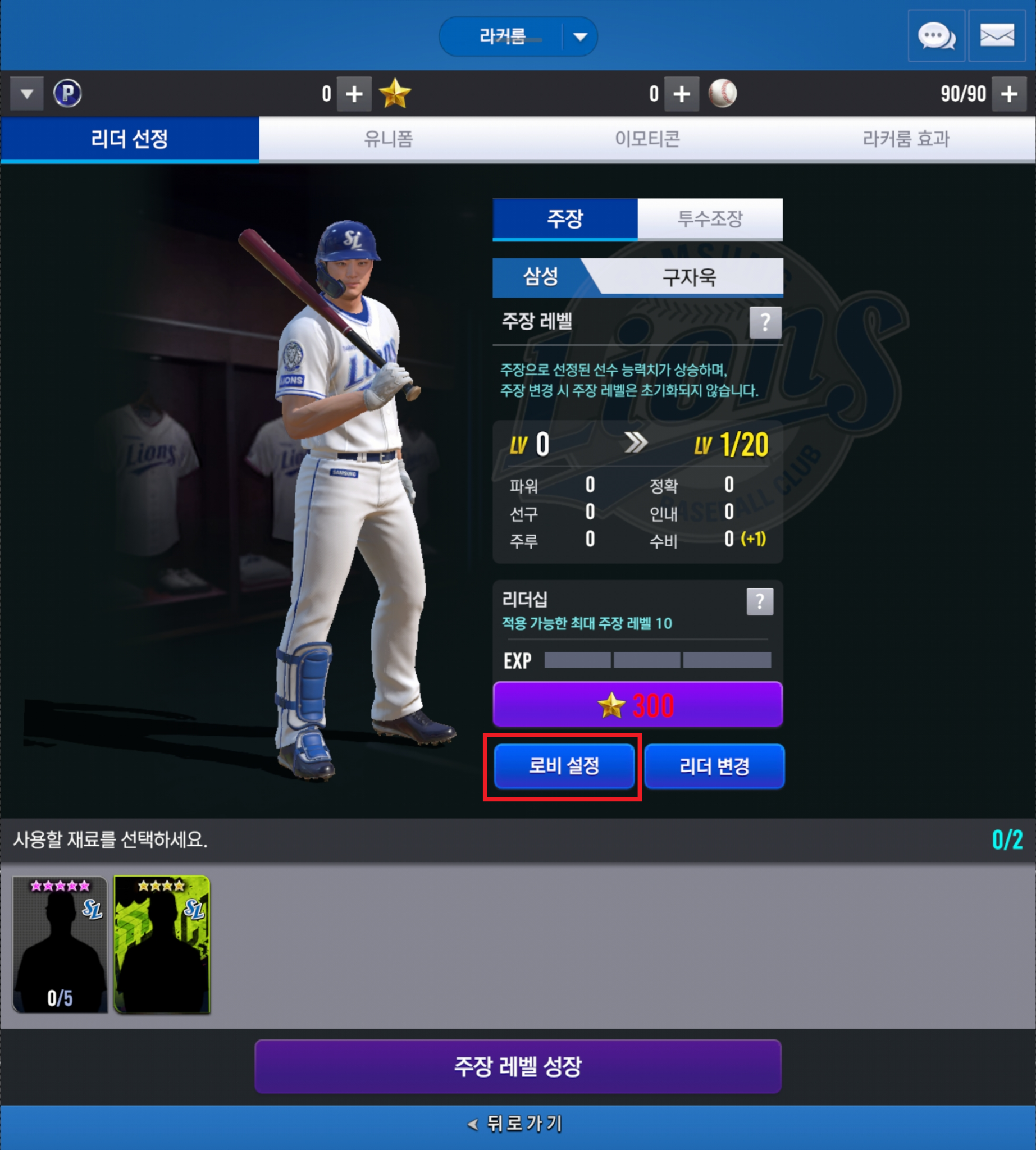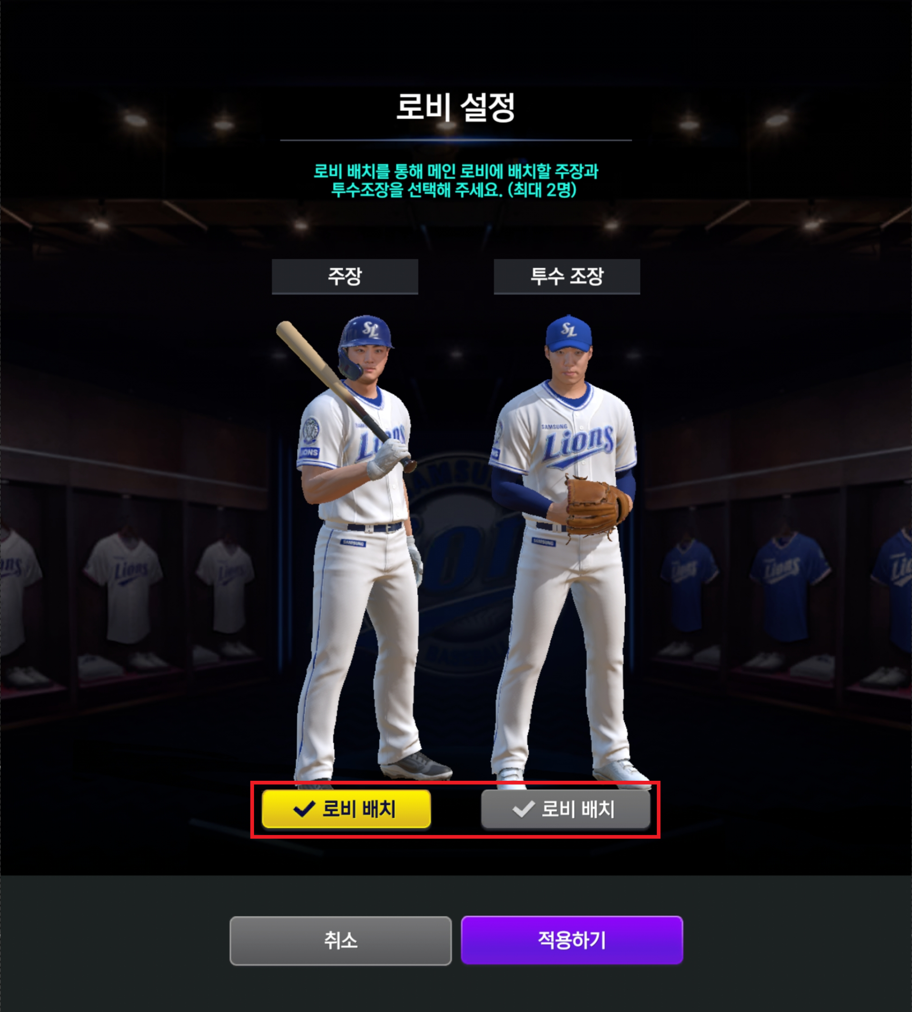 - 주장과 투수 조장이 모두 선정되어 있다면, [로비 설정]을 통해 로비에 등장할 선수를 선택할 수 있습니다.