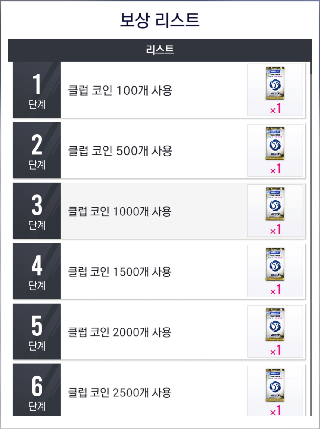 - 업데이트 이후 사용한 클럽 코인량부터 신규 업적에 포함되며 업적 달성 시 [3~5성 시즌 카드 구단선택팩 x1]를 획득하실 수 있습니다.