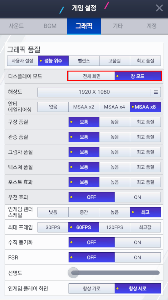 * 단축키 외 게임 설정>그래픽>디스플레이 모드를 통해서도 창 <->전체화면을 변경할 수 있습니다.