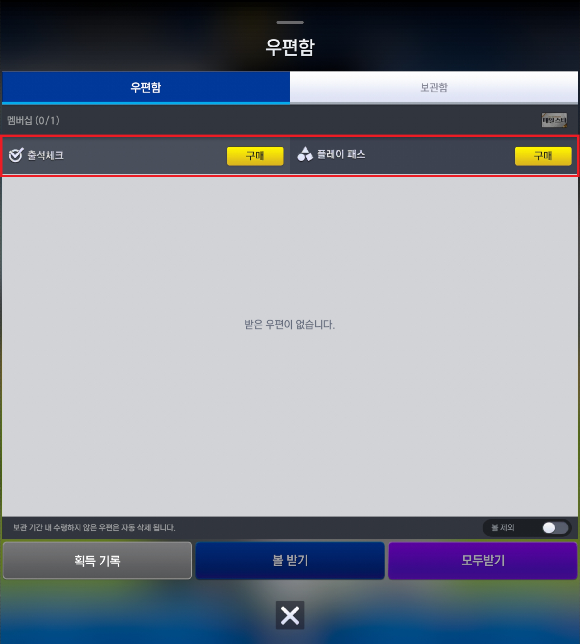 - 우편함에서 프리미엄 출석 체크와 플레이 패스 적용 여부를 확인할 수 있습니다.