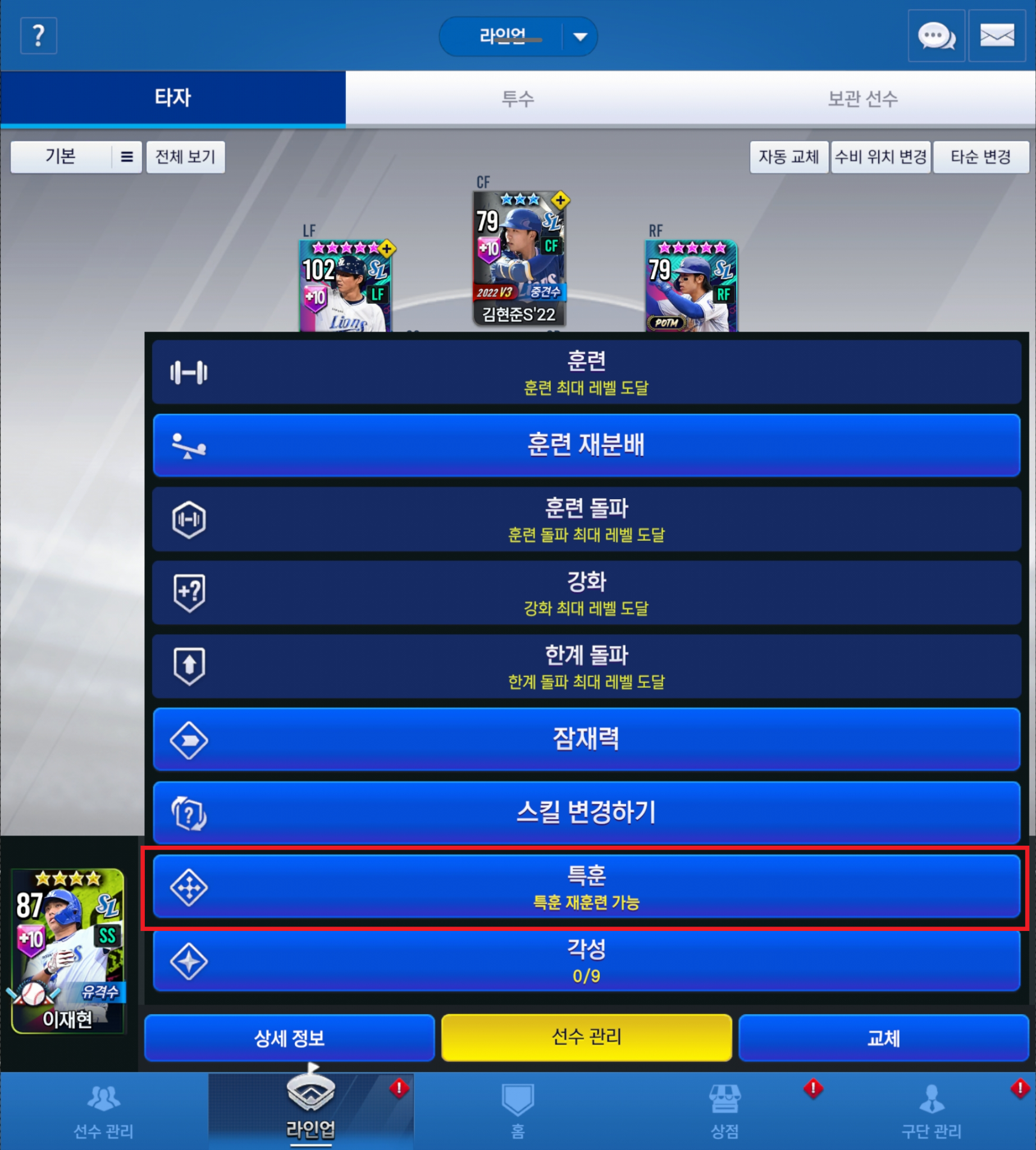 - 라인업 내 선수 관리에서 특훈을 모두 진행한 선수라도 특훈 버튼을 통해 특훈 재훈련을 진행하실 수 있습니다.