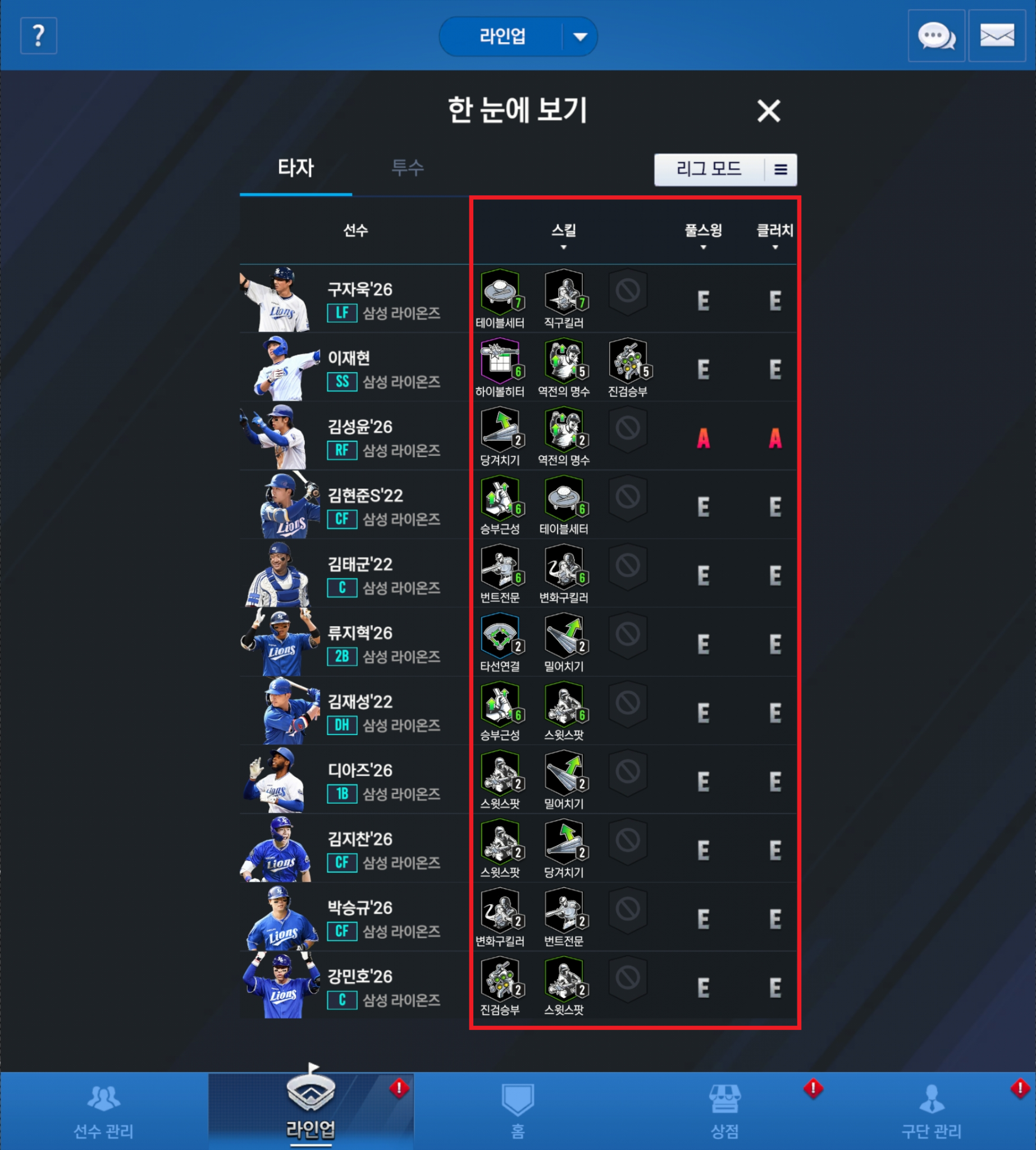 - 라인업 한눈에 보기에서 스킬을 먼저 확인하실 수 있도록 잠재력-스킬 순서가 변경됩니다.