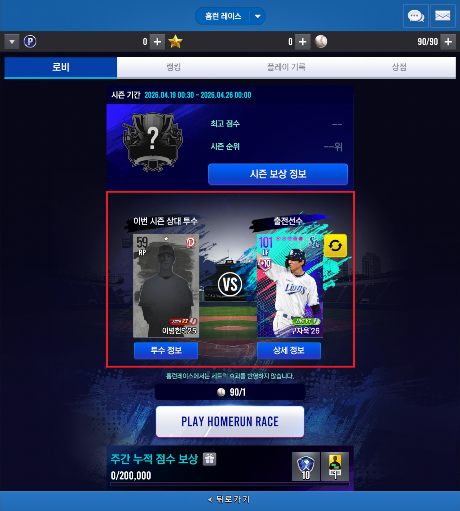 - 홈런 레이스 로비 화면이 상대 투수의 경기장으로 노출됩니다.