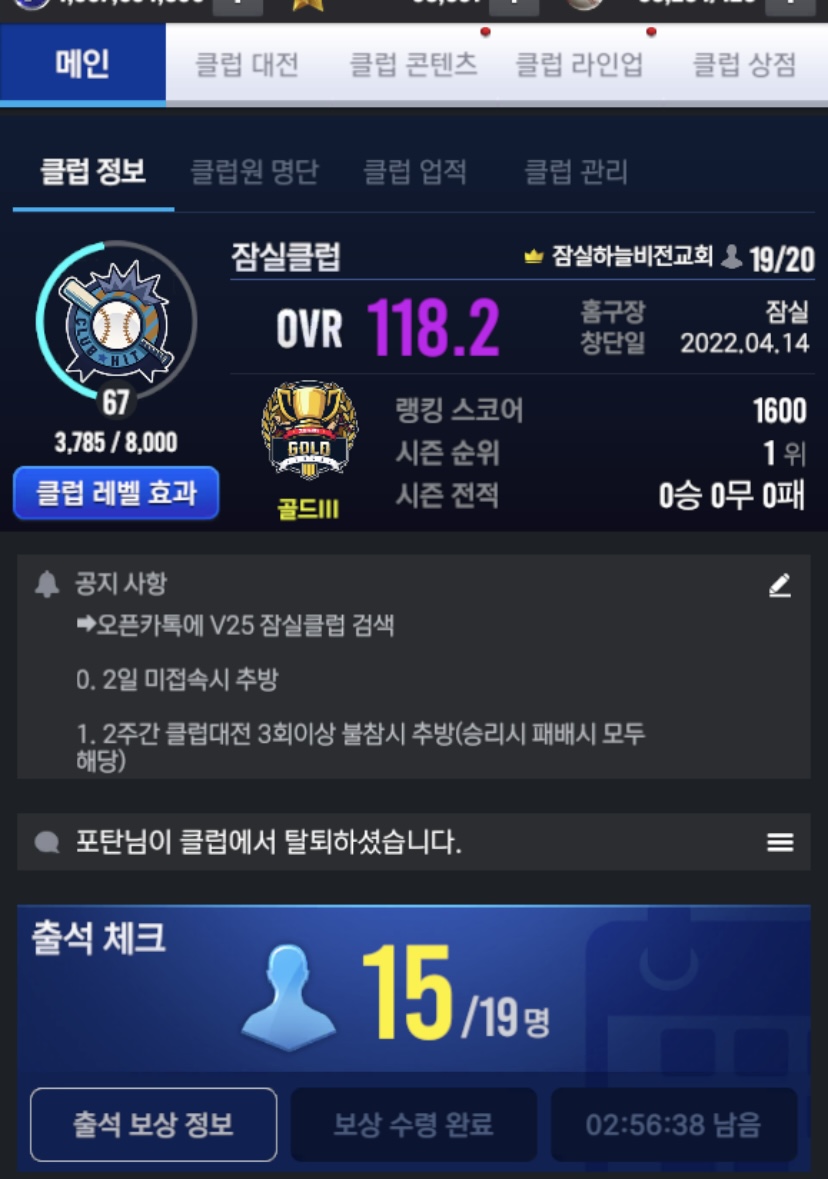 -클럽 승부치기 보상 수령가능 (도루 : 수령 가능, 탈삼진 : 진행 중)