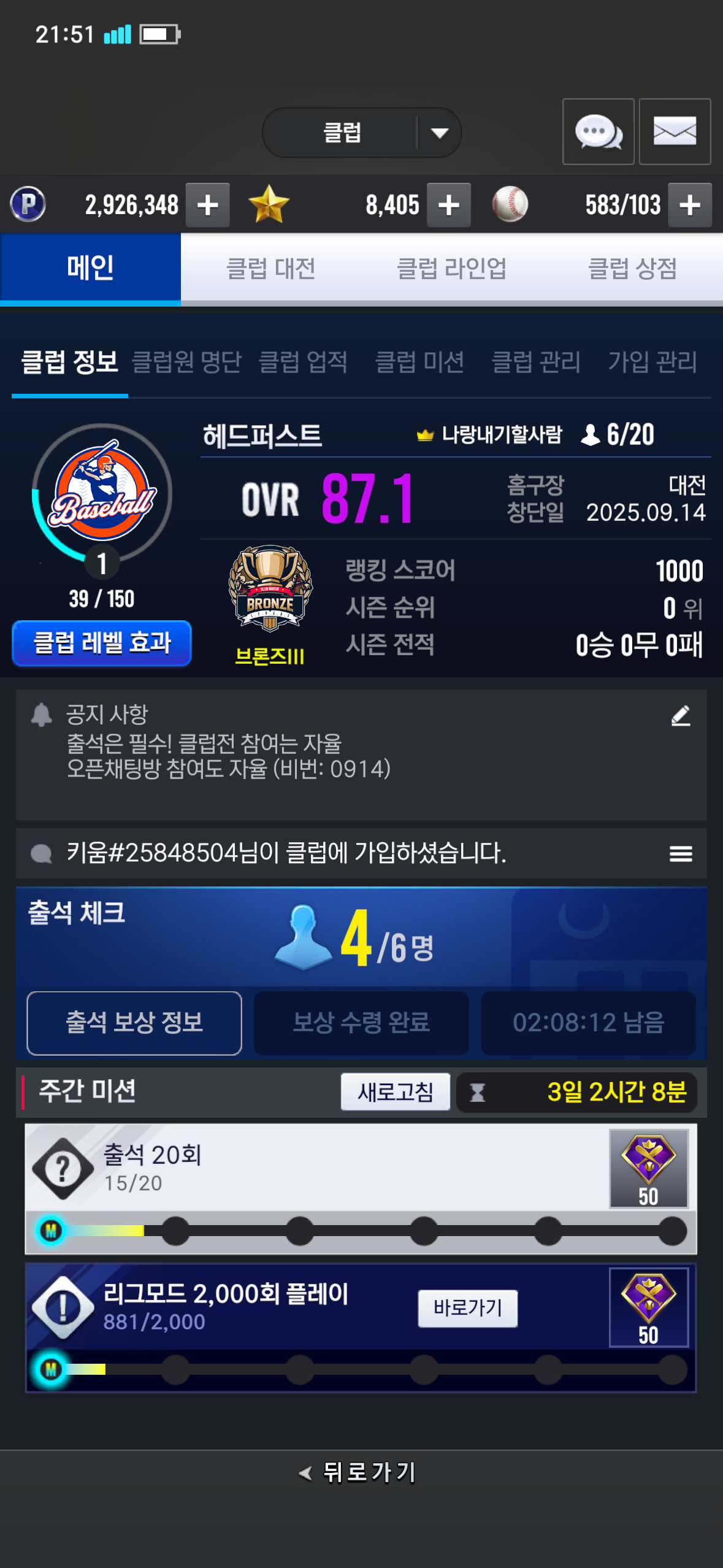저희 헤드퍼스트 클럽은 9월14에 개설된 신규 클럽으로 신규 인원을 모집하고 있습니다. 아직 신규 클럽인지라 초보 분들도 환영합니다. 저희 클럽은 오픈채팅방이 있습니다. 초보분들도 질문 많이 하셔도 됩니다. 저희 클럽에는 컴프야를 2년 넘게 했지만 계정을 정리하고 새롭게 키우는 분들이 현재 대다수 입니다(고수분들이 많다는 거겠죠?)
