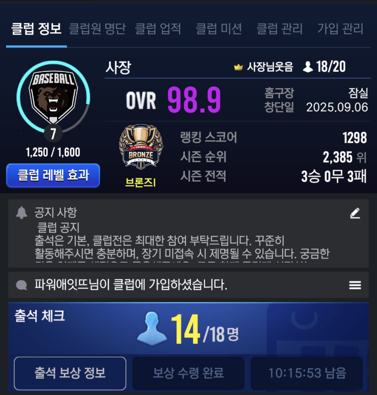 • 클럽 레벨 : Lv.7 (브론즈1)