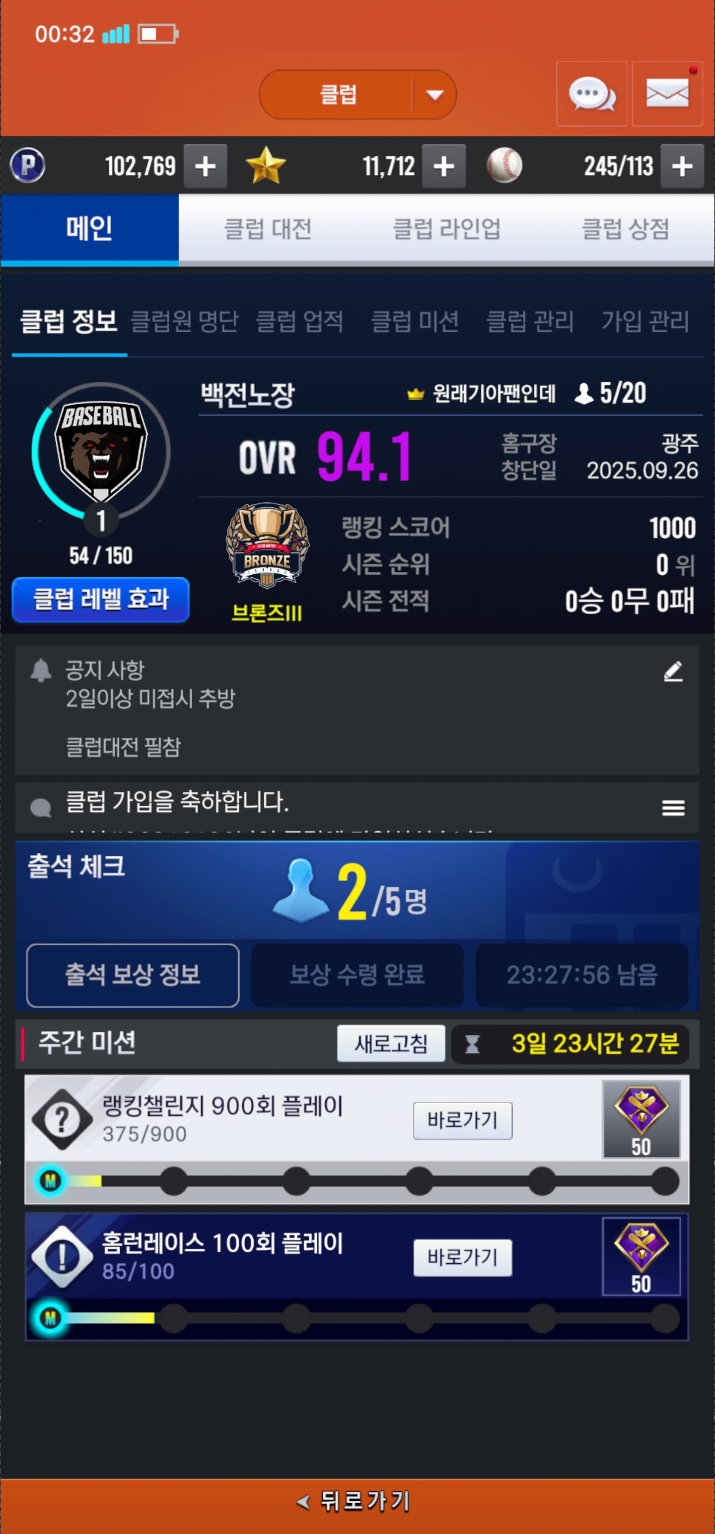 매일 출석. 클럽대전 참여가능하신분 모두 오세요 자리넉넉합니다