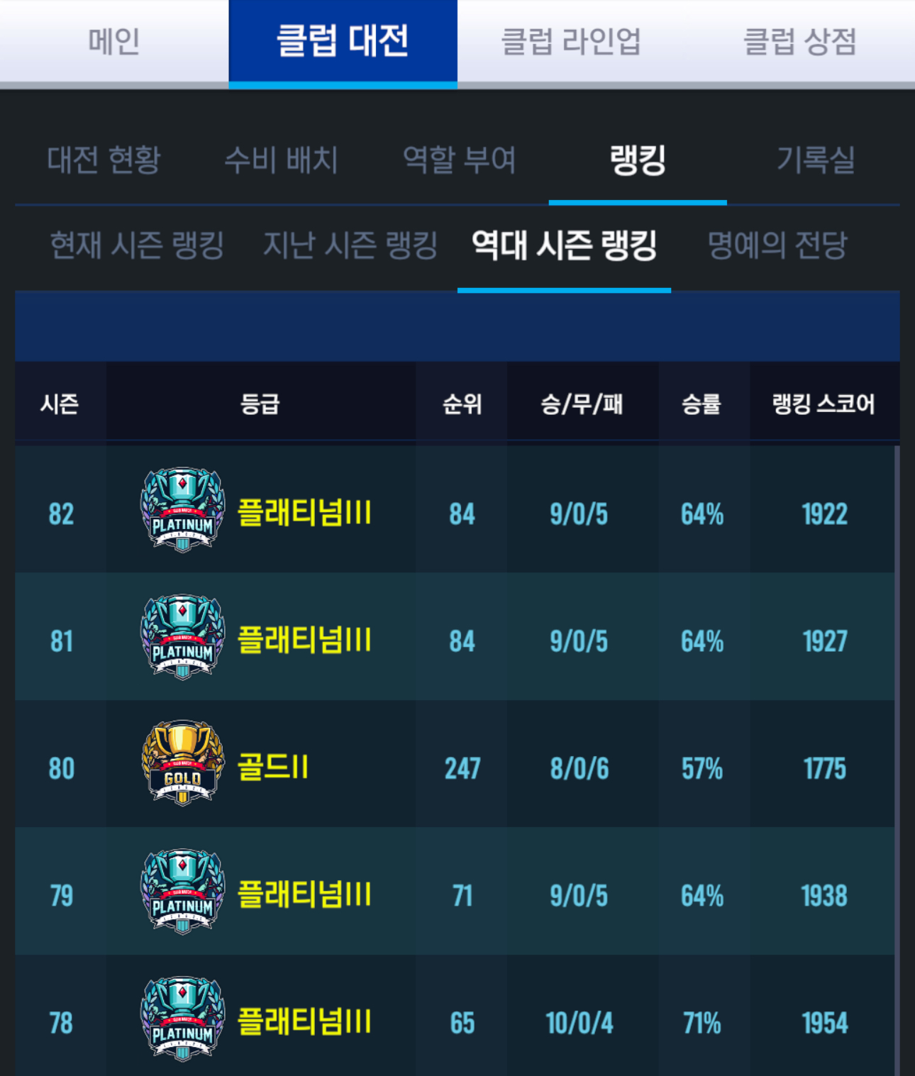 클럽 성적도 플래티넘 꾸준히 진입하고 있습니다.