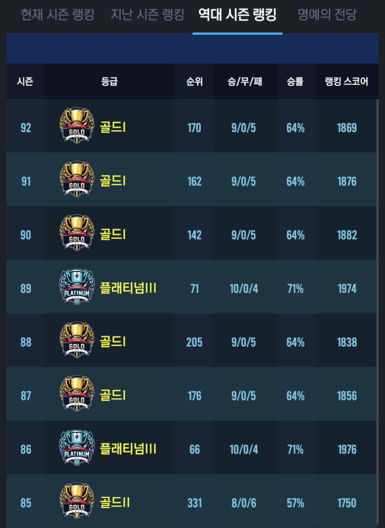 클럽 성적도 플래티넘/골드 꾸준히 진입하고 있습니다.