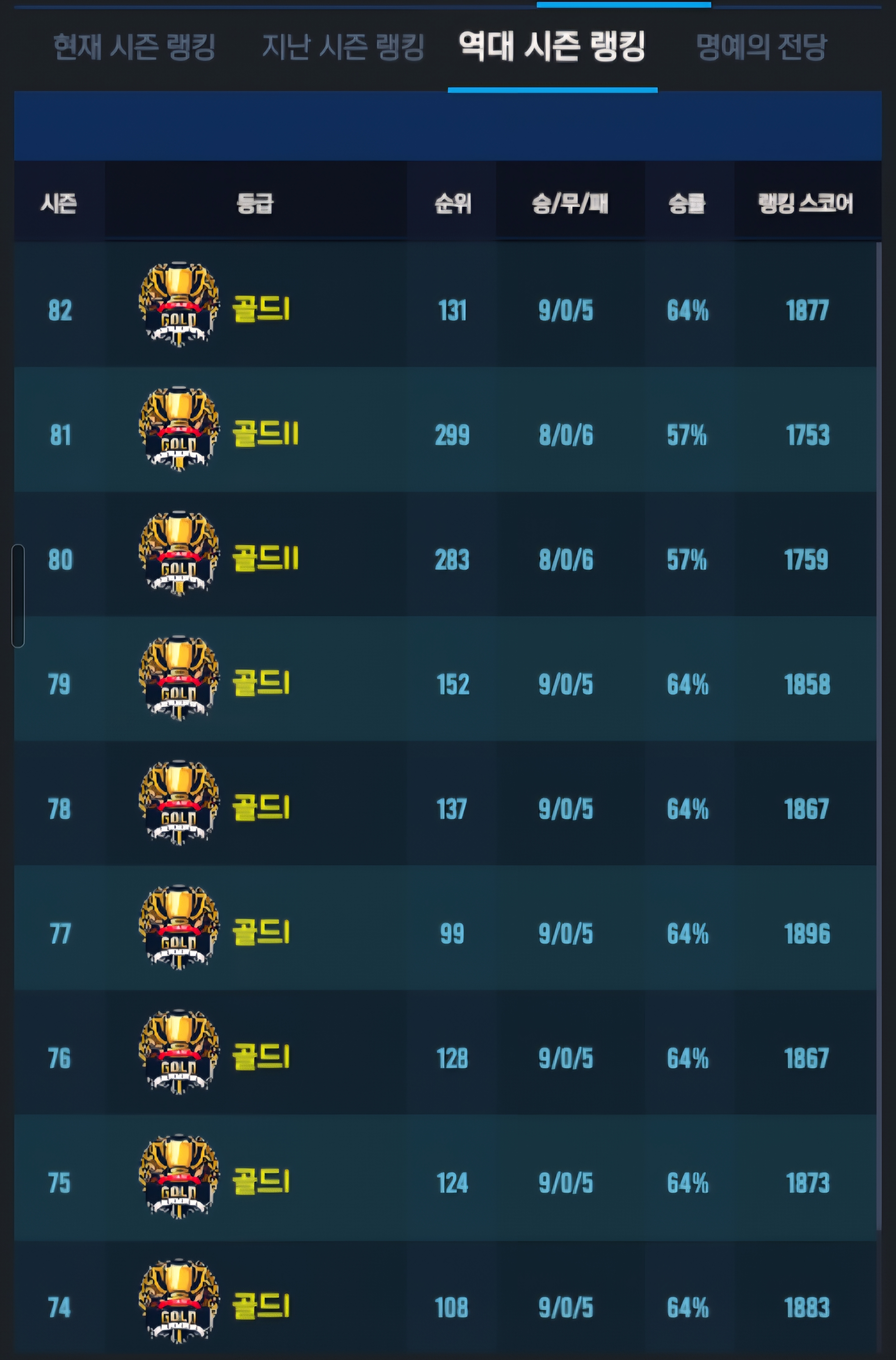 IN100을 목표로 하고 있으며 현재는 매시즌 골드1-골드2 유지중입니다. 45렙 클럽으로 상점에 모든 아이템 다 구매 가능합니다 :)