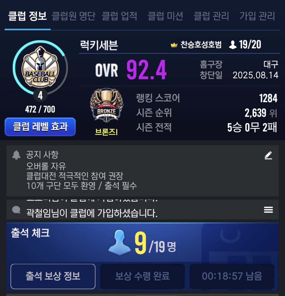 신청 없이 자유 가입입니다 클럽대전 출첵 꾸준히 해주실 분 대환영입니다