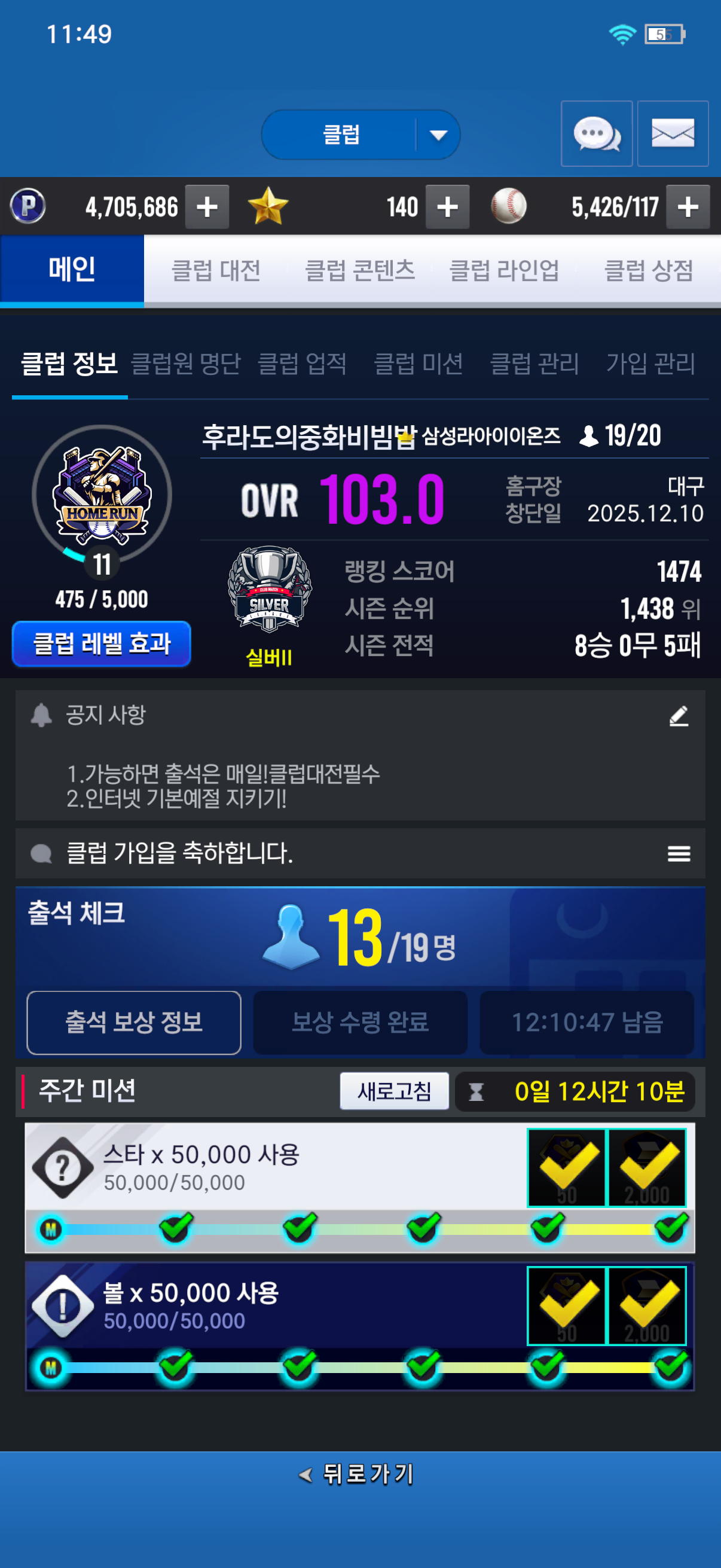 출석은 매일 해주시고 클럽대전도 필수입니다.(결과는 상관 없음)