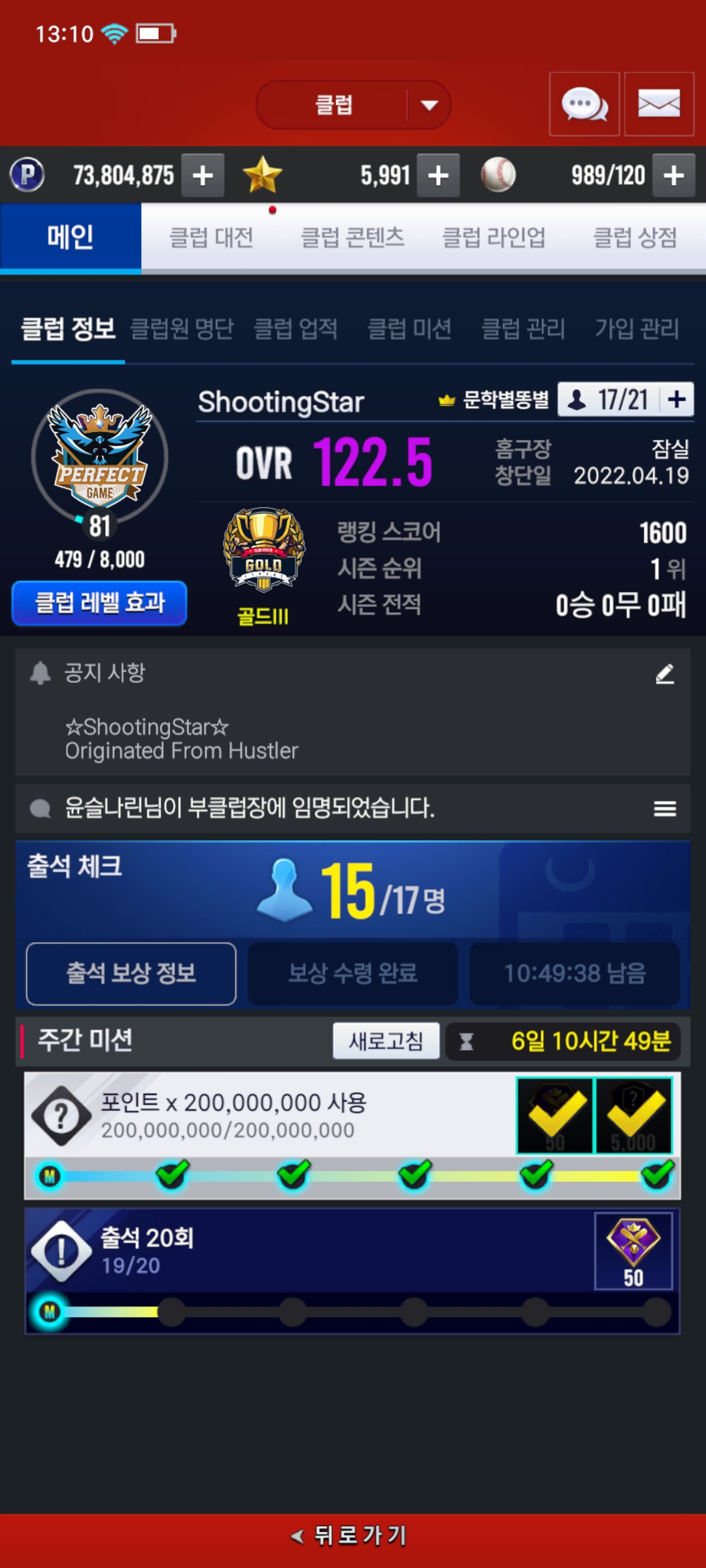 가입조건은 랭킹챌린지 포인트갱신 기준 in2000과 톡방참여입니다. 최근시즌 결원으로 순위에서 조금 밀렸으나 그외 시즌엔 꾸준히 in50을 노리고있습니다.