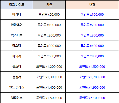 - 리그 데일리 보너스에서 획득 가능한 포인트량도 전체 상향됩니다.