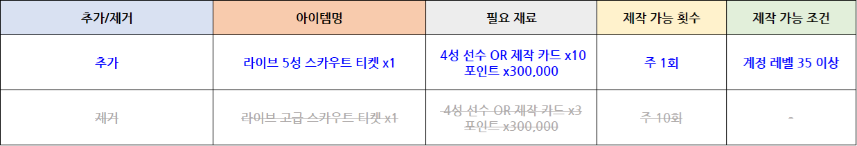 제거되며, [라이브 5성 스카우트 티켓]이 추가됩니다.