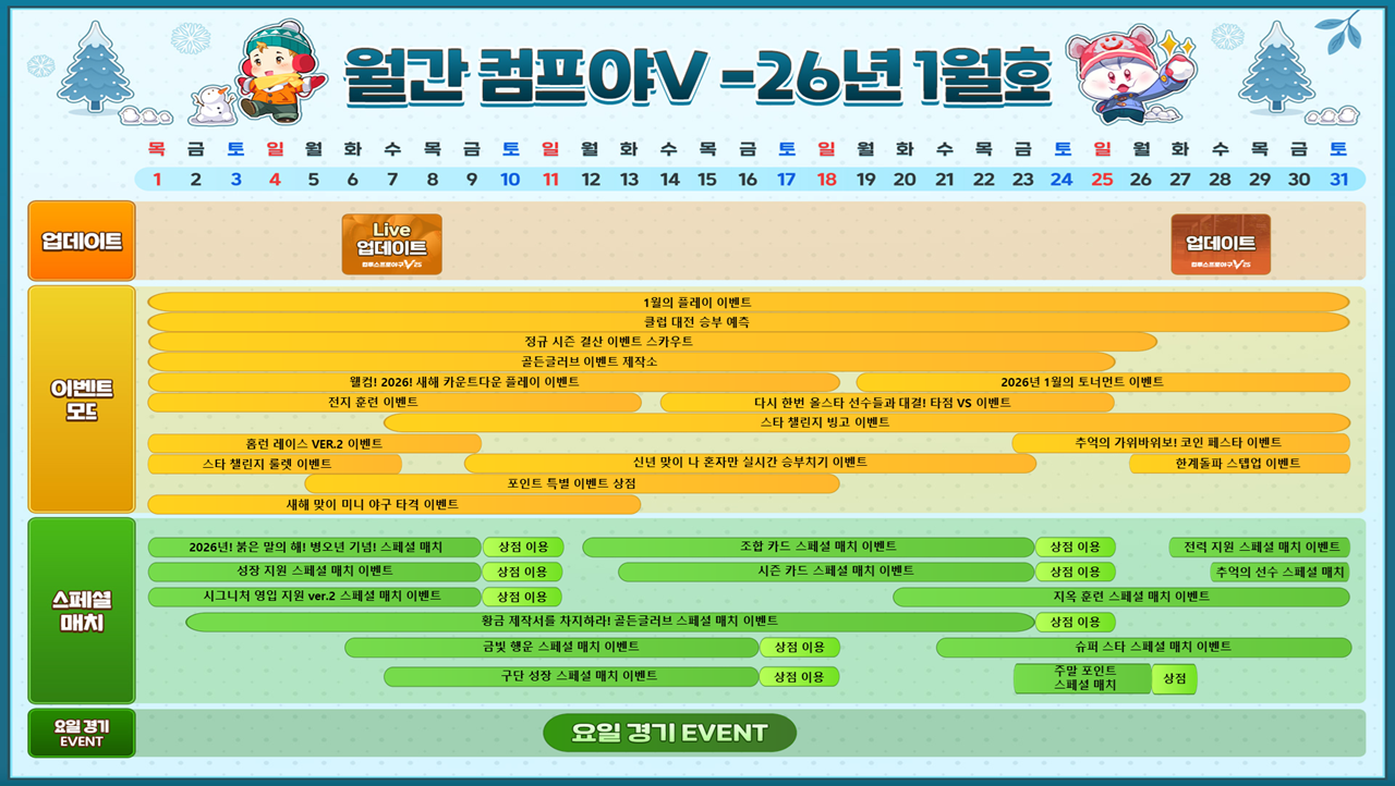 1주차 (1/1~1/11) | 🛠 Live 업데이트(1/7) 🎁포인트 특별 이벤트 상점 🎉1월의 플레이 이벤트 🎉스타 챌린지 빙고 🎉신년 맞이 나 혼자만 실시간 승부치기 🆚시그니처 영입 지원 ver.2 스페셜 매치 🆚골든글러브 스페셜 매치 🆚구단 성장 스페셜 매치 |