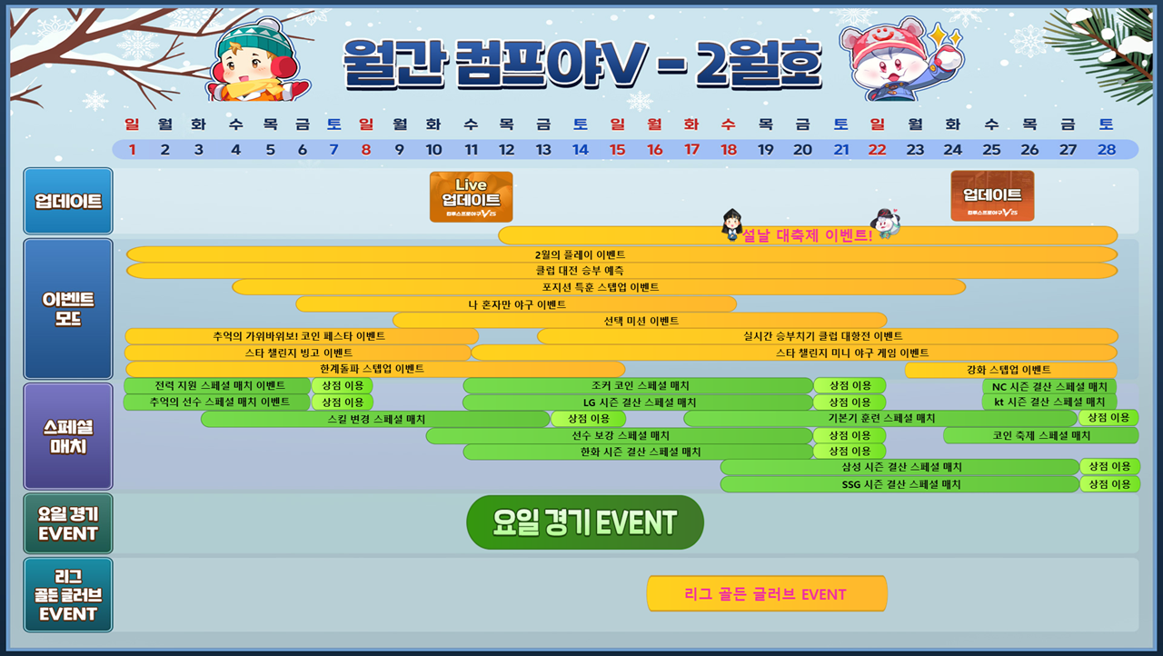 2주차 (2/9~2/15) | 🛠 22차 Live 업데이트(2/11) 🎉선택 미션 이벤트 🎉실시간 승부치기 클럽 대항전 🎁스타 챌린지 미니야구 이벤트!🎁 🎁설날 대축제!🎁 🆚 조커 코인 스페셜 매치 🆚 LG 결산 스페셜 매치 🆚 한화 결산 스페셜 매치 |