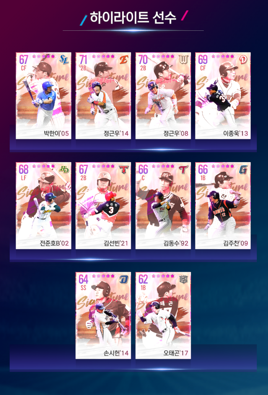 - 구단별 1종의 시그니처 카드를 대상으로 시그니처 픽업 스카우트가 진행됩니다.